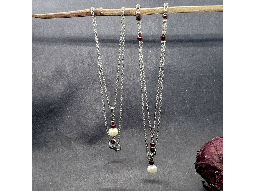 Kratší řetízek zdobí jemná trojice: čistá sladkovodní perla, hluboce rudý granát a drobný fialový kamínek, který dodává celku magický nádech.