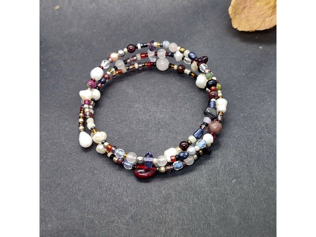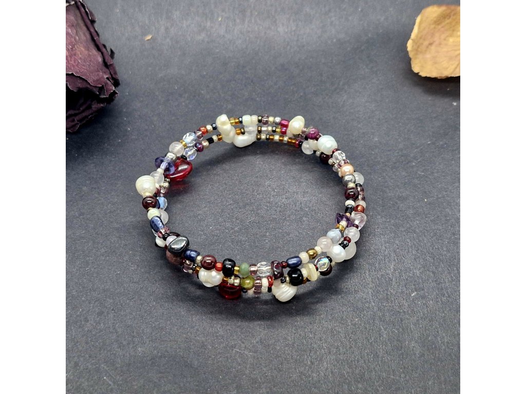 Rozměry: Univerzální. Průměr 6 cm. Perly 4 - 6 mm. Minerály 4 - 6 mm. Rokajl a sklo cca 2 - 6 mm.
