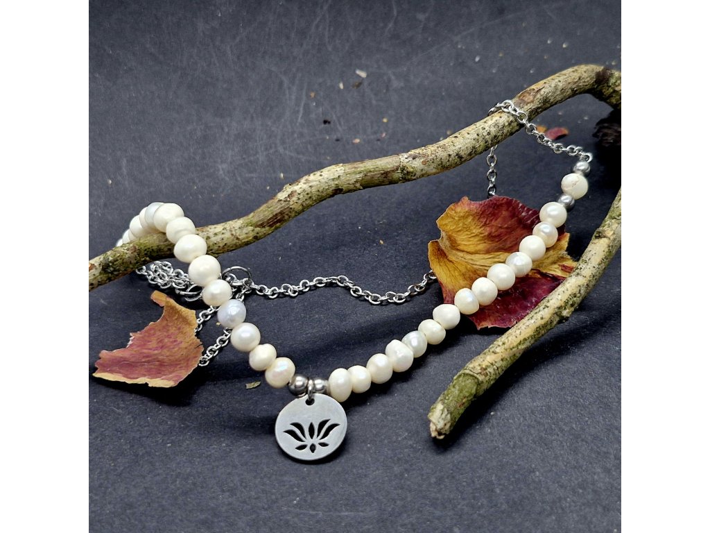 Náhrdelník tvoří řetízek s napevno zakomponovanými říčními perličkami a ocelový přívěsek s lotosovým květem.