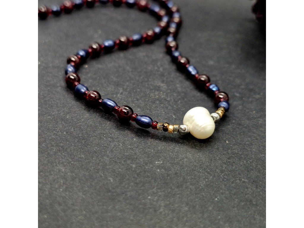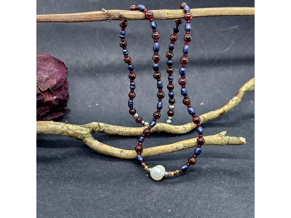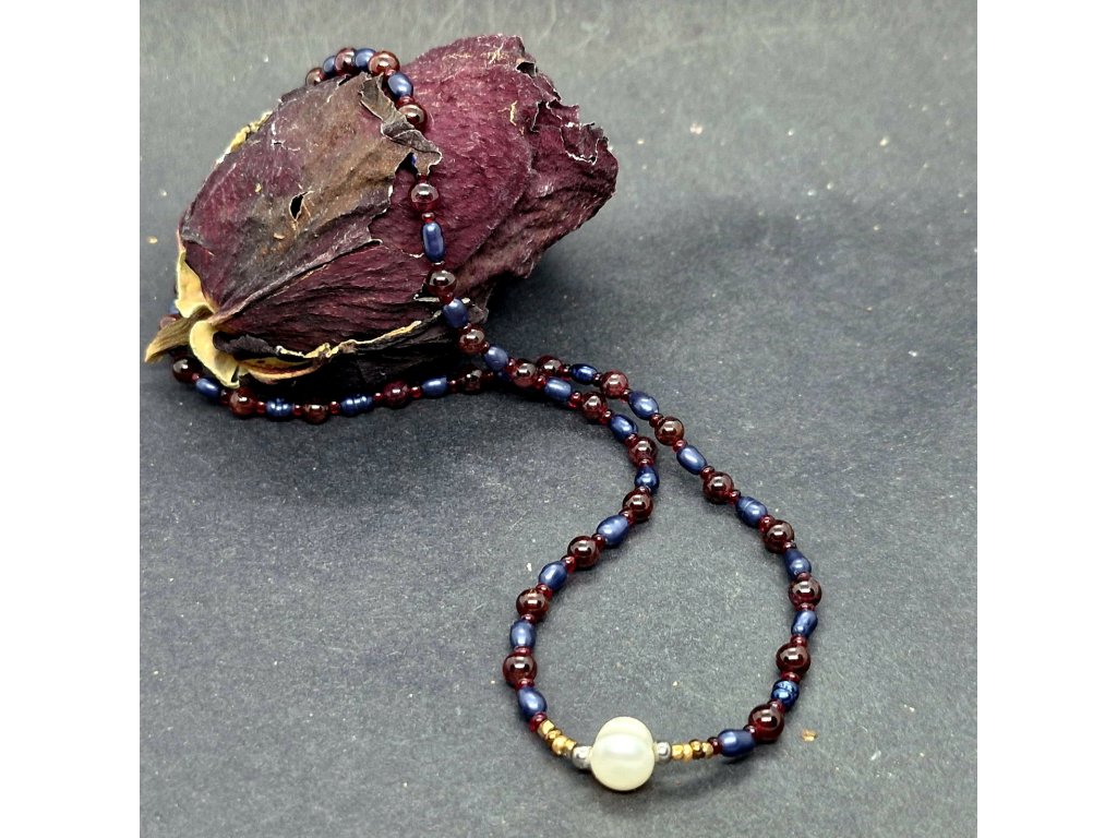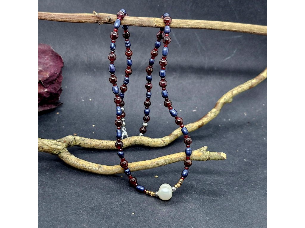 Dopřejte si šperk, který v sobě nese náboj noci a nekonečnou eleganci. Tento náhrdelník je fascinujícím spojením temně rudého granátu, který je symbolem životní energie, a modrých sladkovodních perel, jejichž hluboké odlesky připomínají hladinu oceánu pod hvězdami.