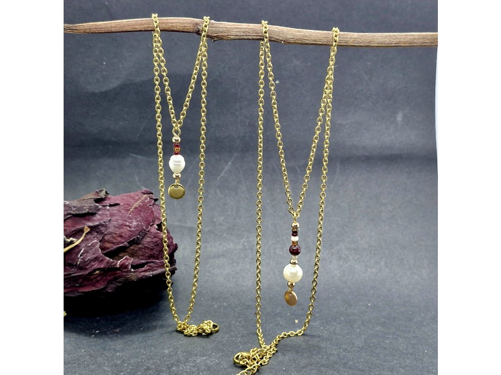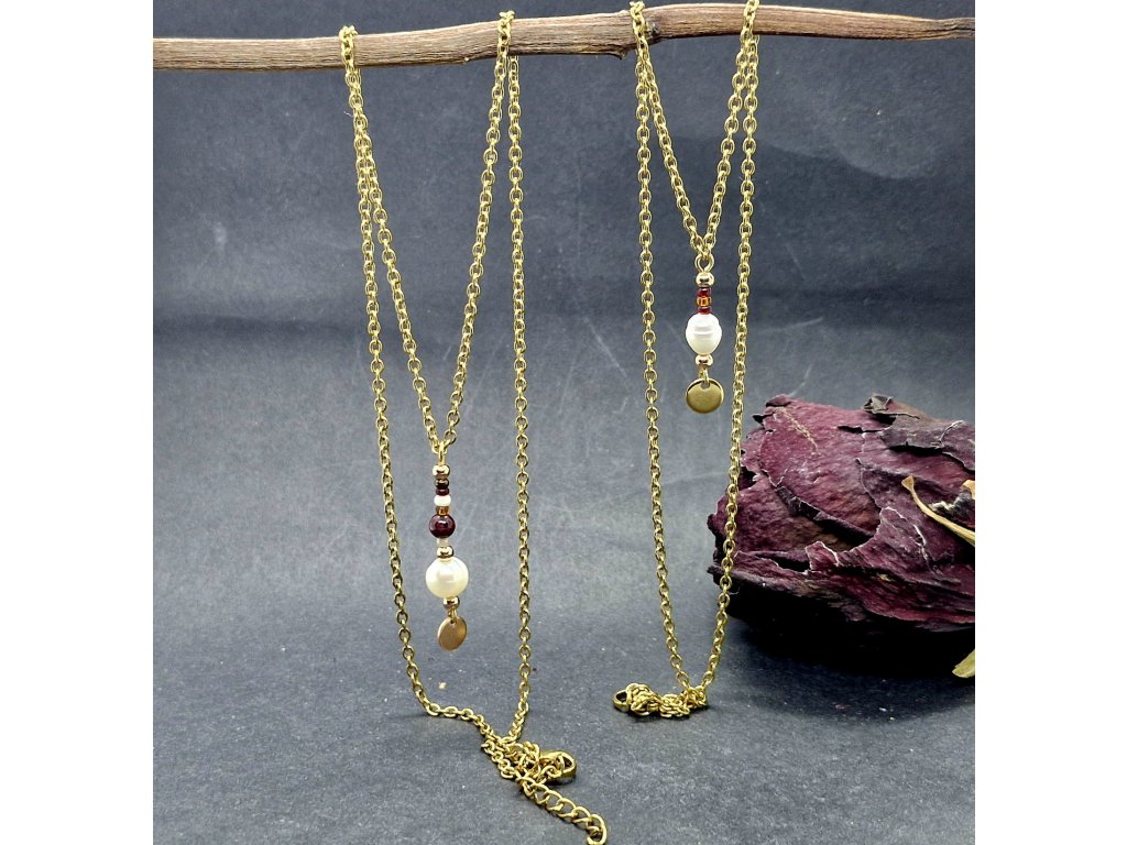 Objevte kouzlo vrstvení, které v sobě snoubí tradici a moderní design. Tento set náhrdelníků z pozlacené nerezové oceli zdobí drobný rokajl, zlatavé kuličky a temně rudý granát. Korunou celého šperku je pravá sladkovodní perla, symbol čistoty a elegance. Šperk, který jemně podtrhne vaši krásu při každém pohybu.