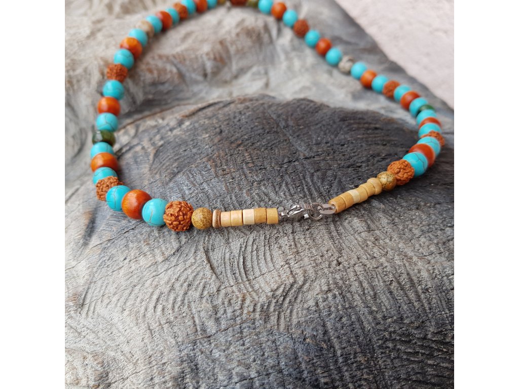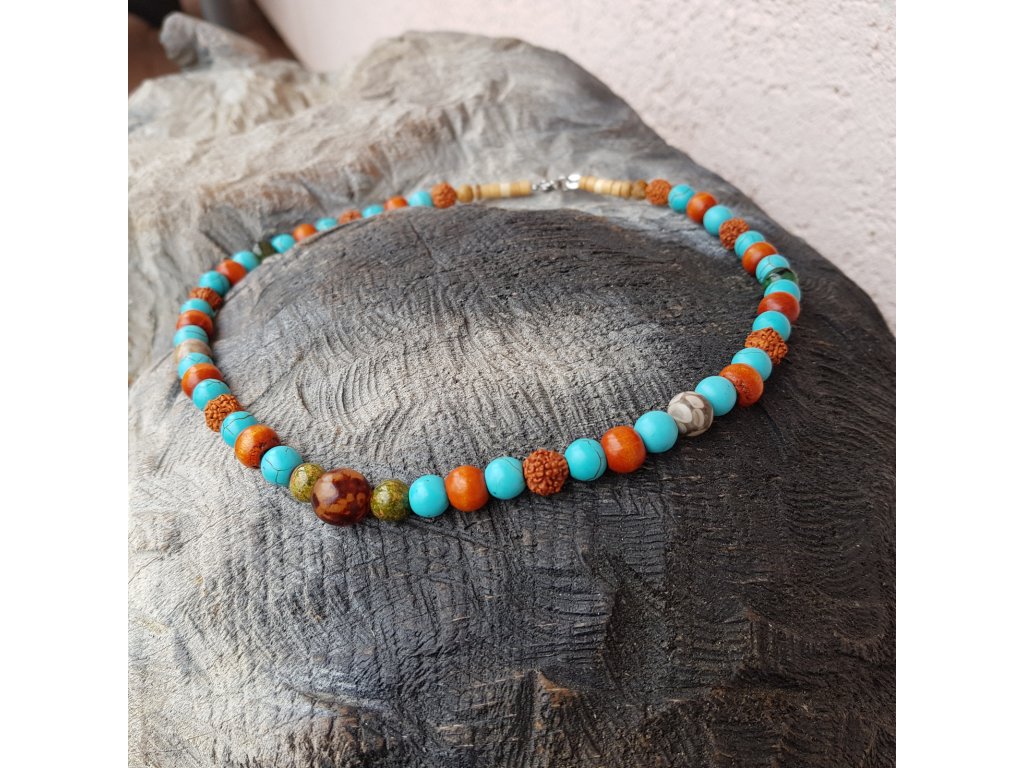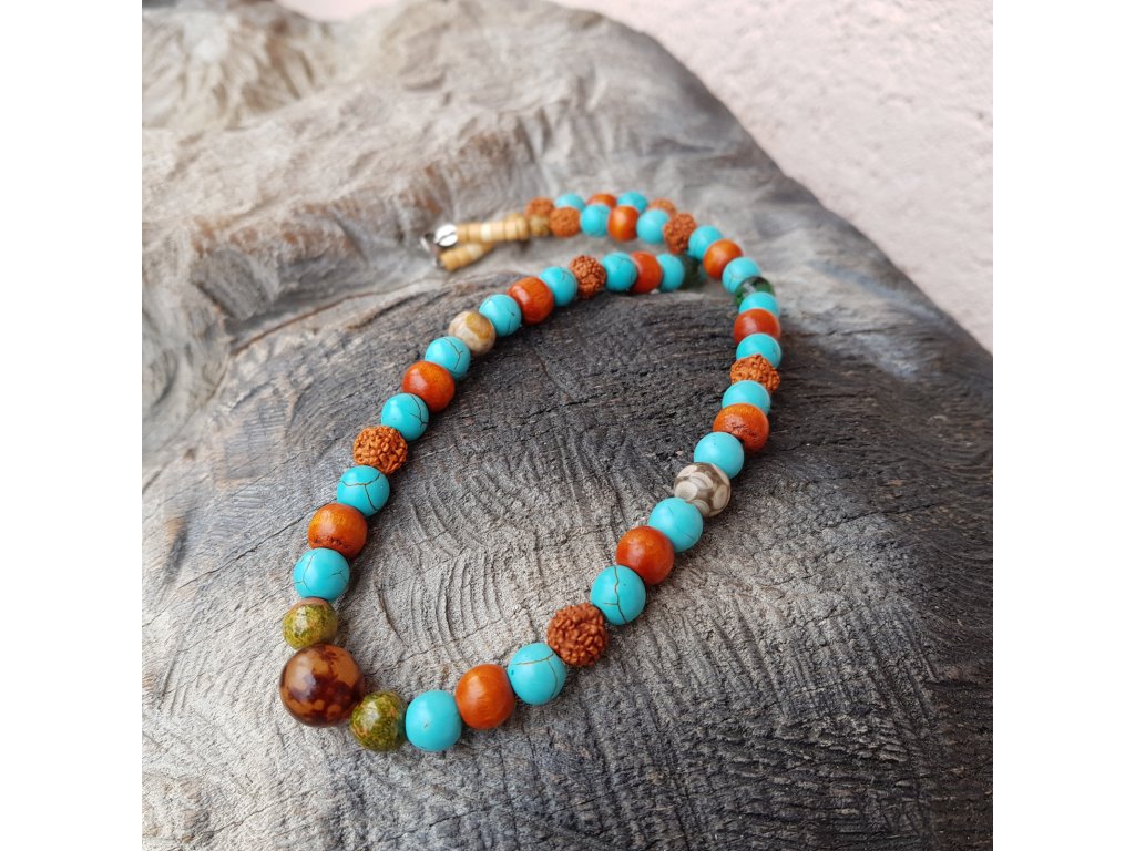Pánský náhrdelník z tyrkenitu, unakitu, achátu, dřeva a semen rudrakshy.