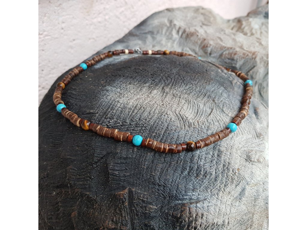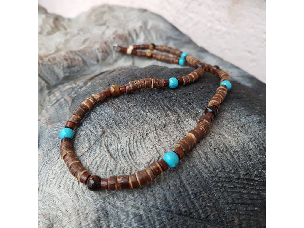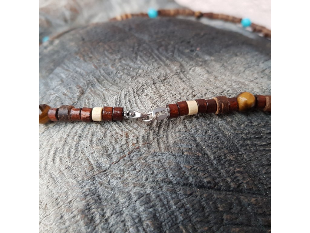 Použili jsme dřevěné rondelky, kokosové dřevo, tygří oko a tyrkenit.