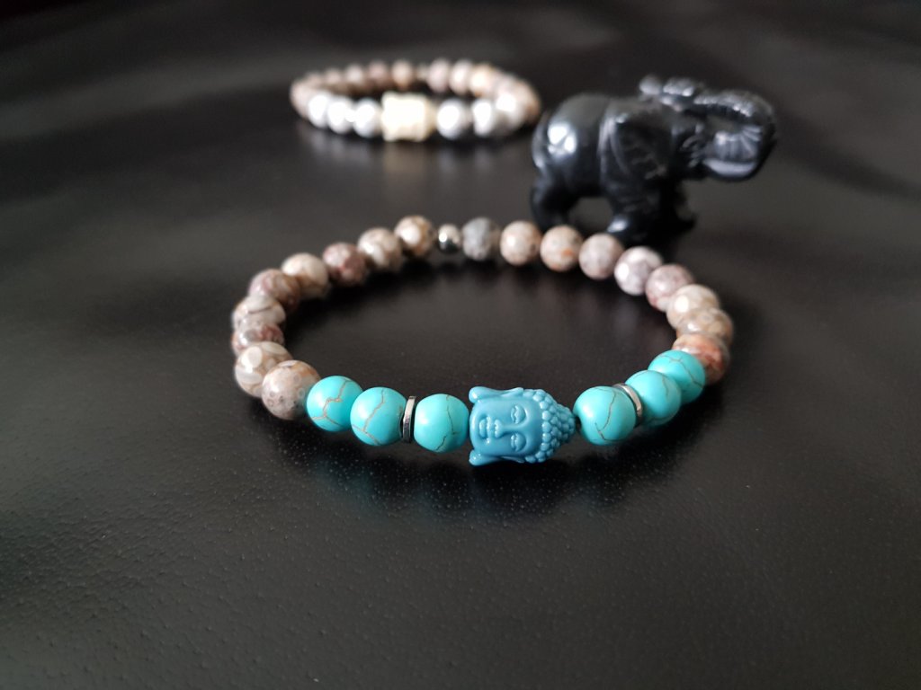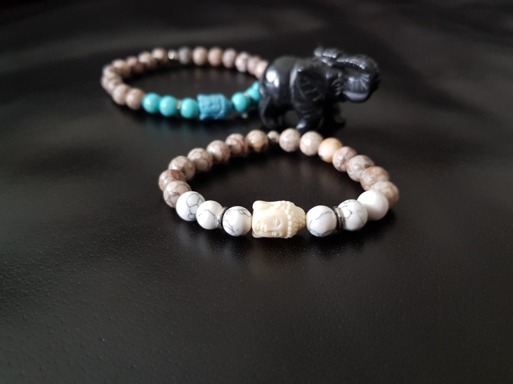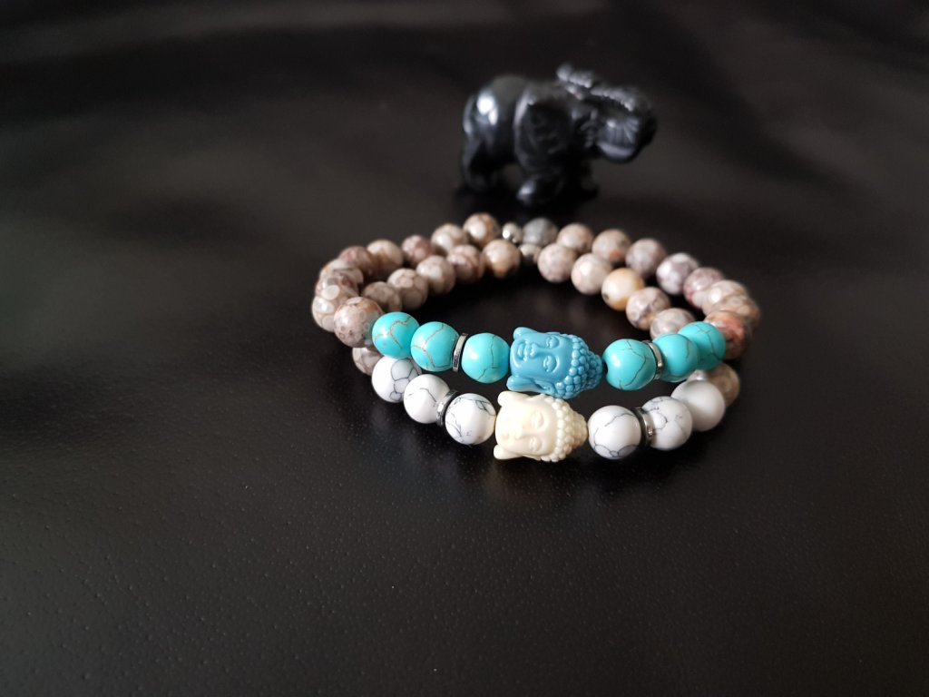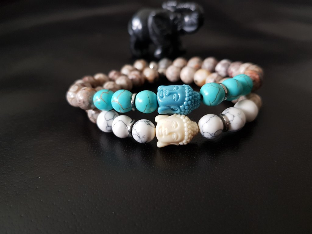 Důkaz lásky, porozumění, přátelství... Náramky pro pár zamilovaných. Použili jsme jaspis (maifanit), tyrkys a howlit o průměru 8 mm. Dominantou jsou hlavičky budhy z rekonstruovaného korálu v bílé a modré barvě.