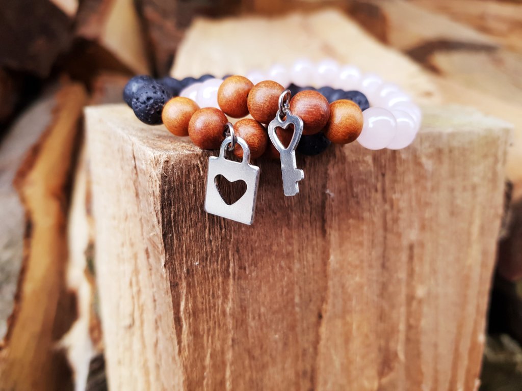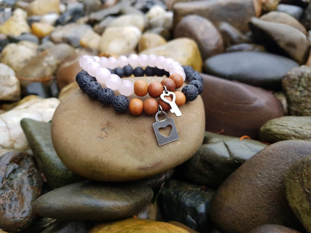 Při tvorbě kolekce "Santal" jsme mysleli i na zamilované:-). Náramky pro pár s přívěsem zámku a klíče z chirurgické oceli. Pánský je z lávového kamene a santalového dřeva, doplněný zámkem se srdcem. Na dámský jsme použili růženín, santalové dřevo a přívěsek klíče se srdíčkem.