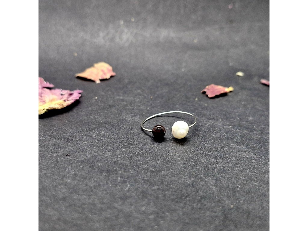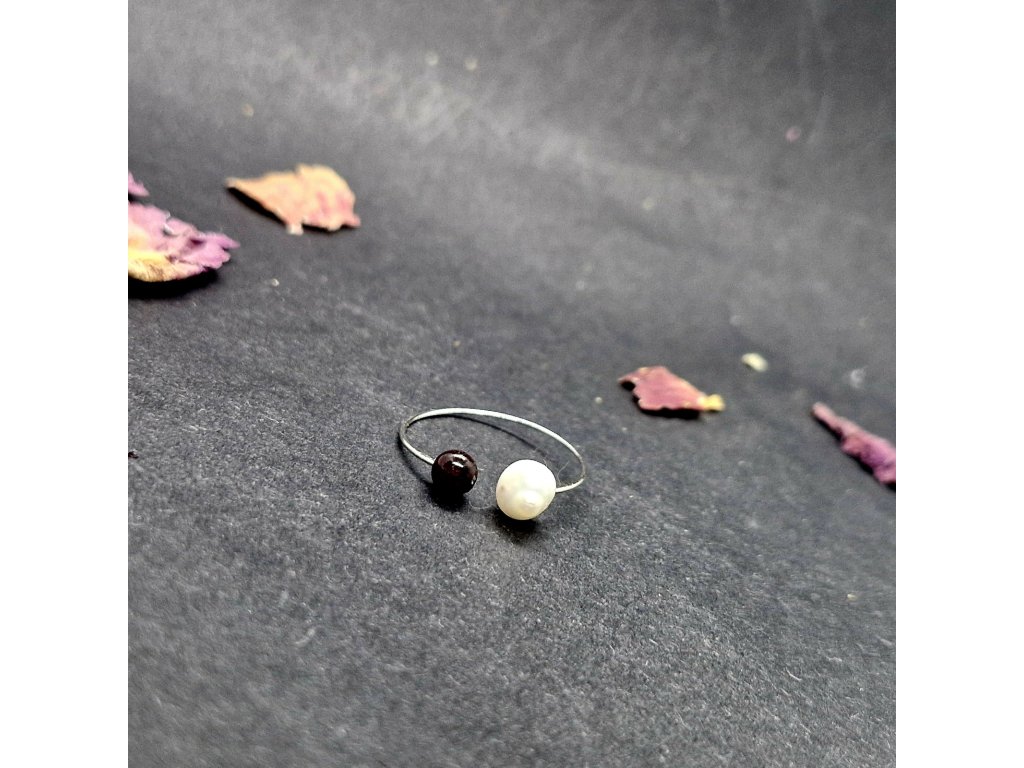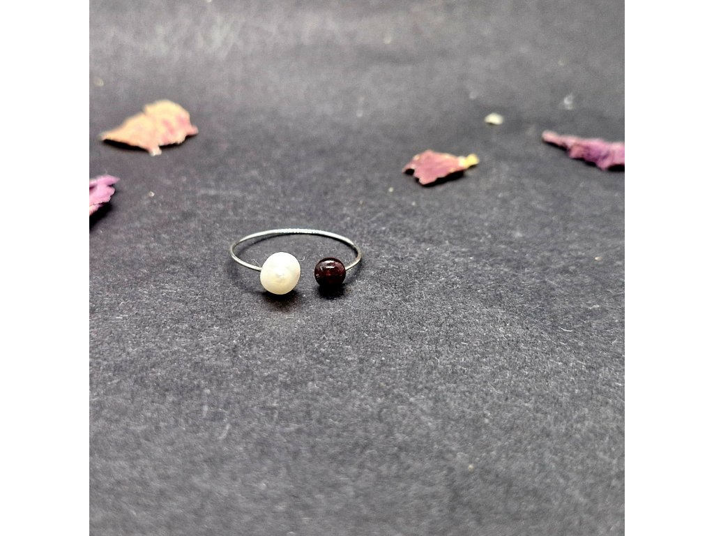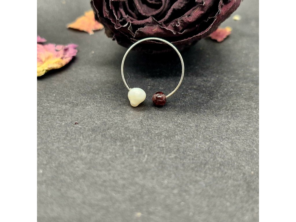 Minimalistický, jemný, něžný...Autorský prstýnek s kuličkou granátu a říční perličkou.