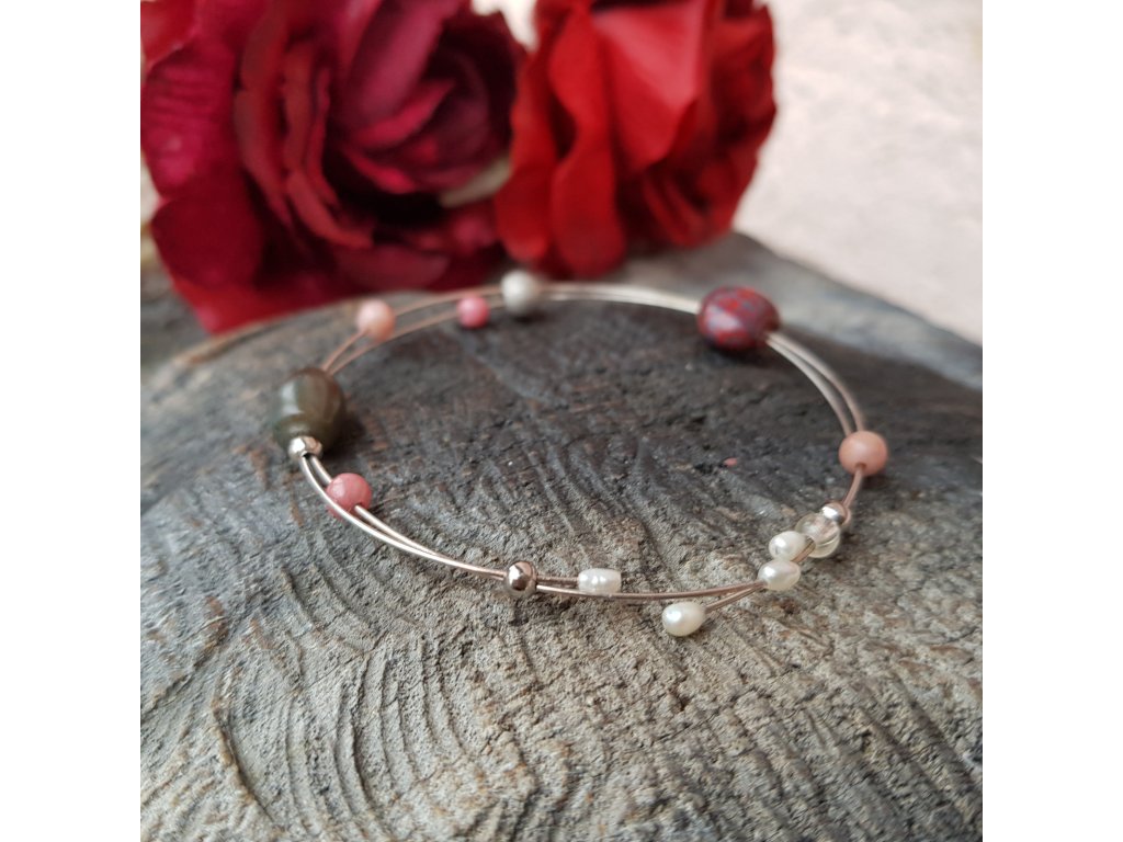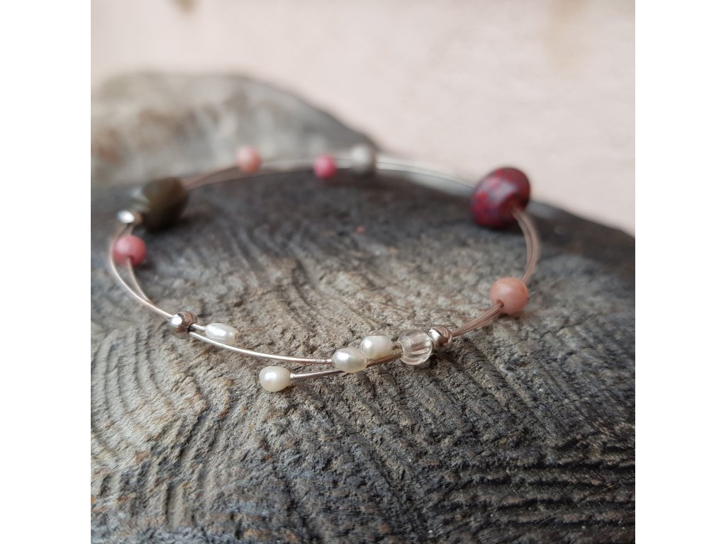 Autorský minimalistický náramek s rodonitem, říčními perličkami, mechovým achátem, perletí, sklem a kuličkami z nerezové oceli.