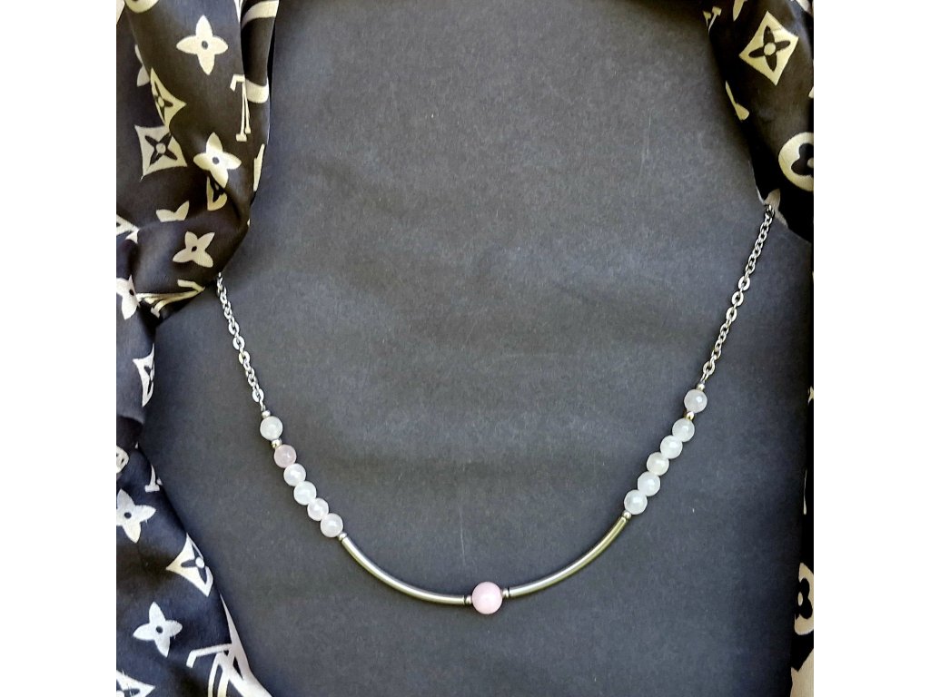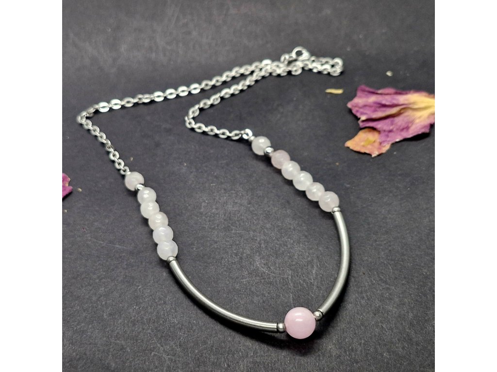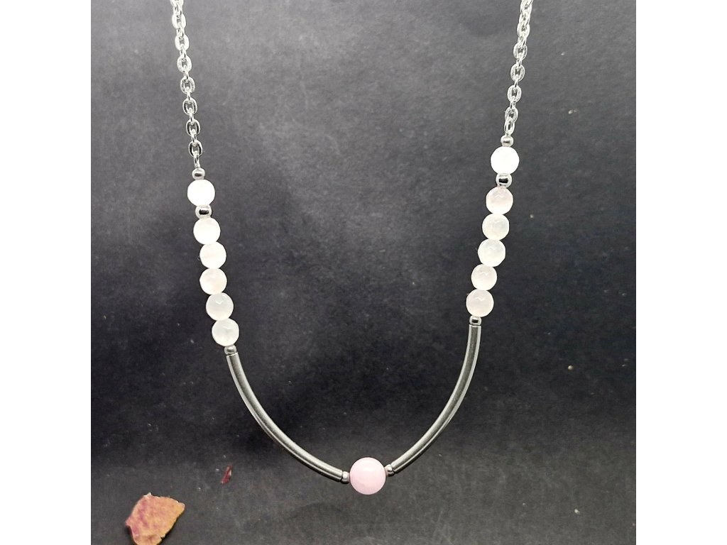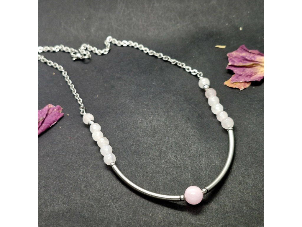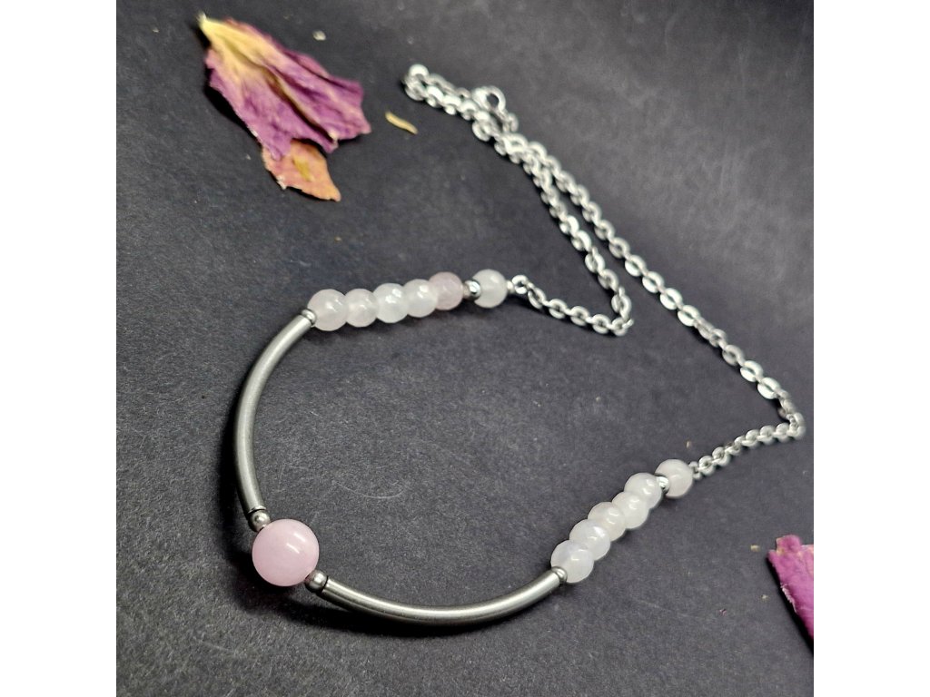 Centrem náhrdelníku je růženín, kámen lásky, soucitu a harmonie. Jeho jemný růžový odstín přináší klid a pohodu, zatímco lesklé ocelové tyčinky dodávají šperku moderní a sofistikovaný vzhled.