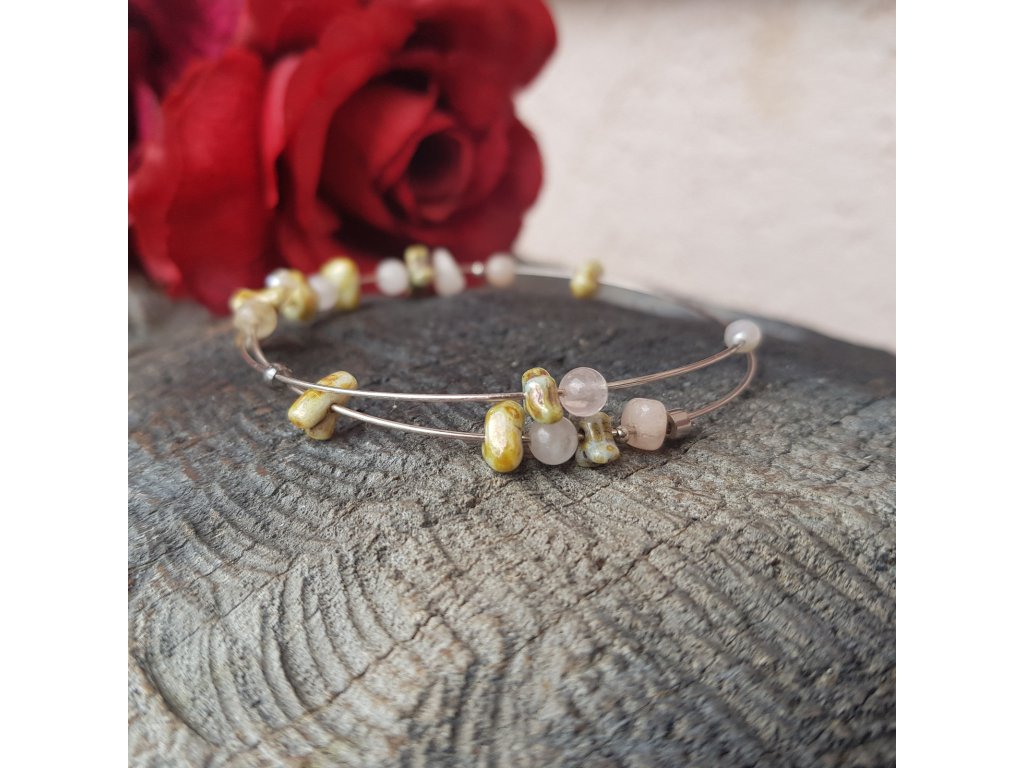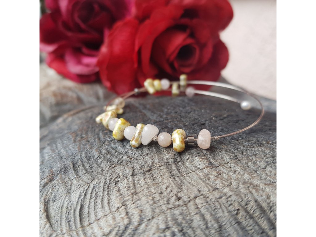 Autorský minimalistický náramek s perletí, říčními perličkami, růženínem, opálem, zušlechtěnými skleněnými kamínky, tromlovanými zlomky růženínu a ocelovými kuličkami.