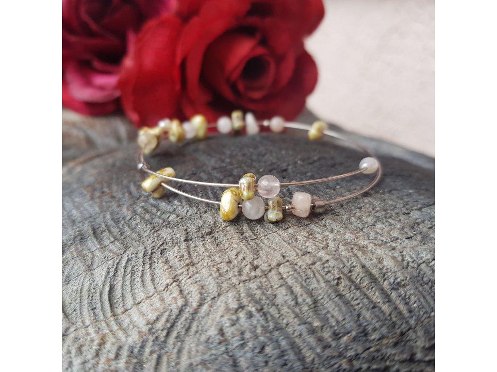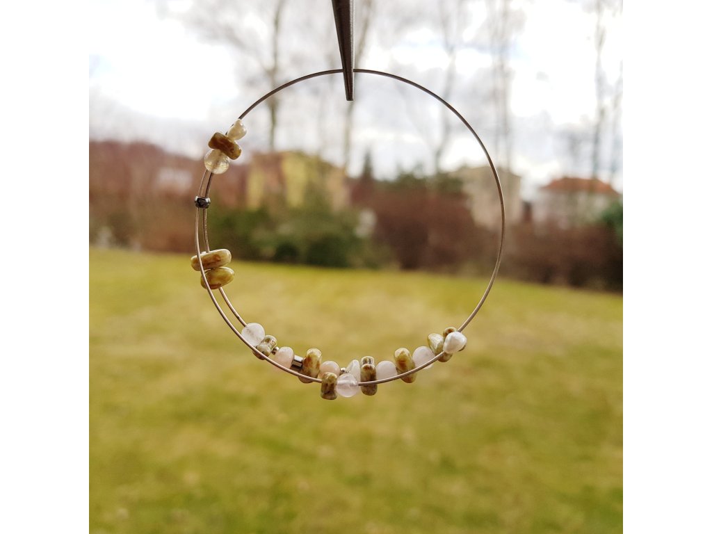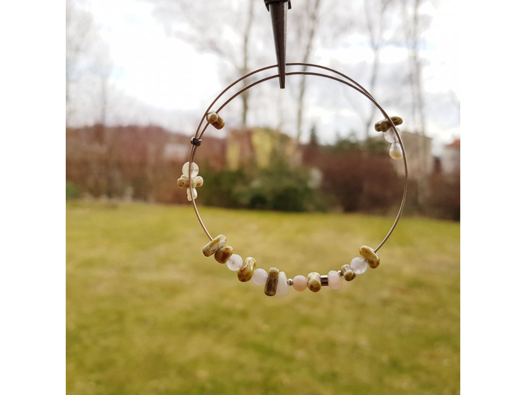 Náramek je z pružné oceli, tudíž se přizpůsobí téměř každému zápěstí. Je lehoučký jako pírko a díky slabému drátku nádherně vyniknou minerály, které se volně pohybují a jakoby levitují.