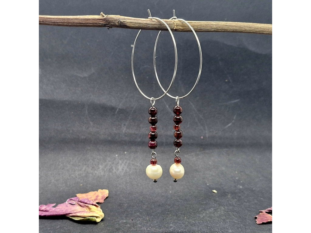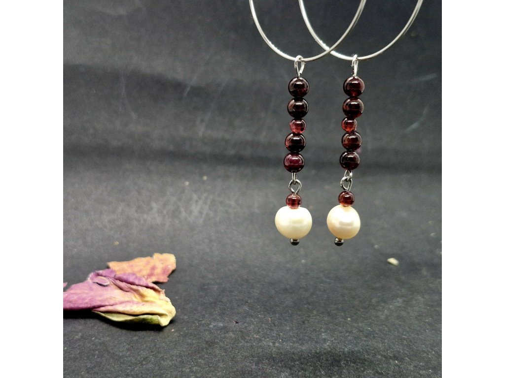 Rozměry: Průměr kroužků 3,5 cm. Přívěsky 4 cm. Granát 4 mm. Perly cca 7 mm.