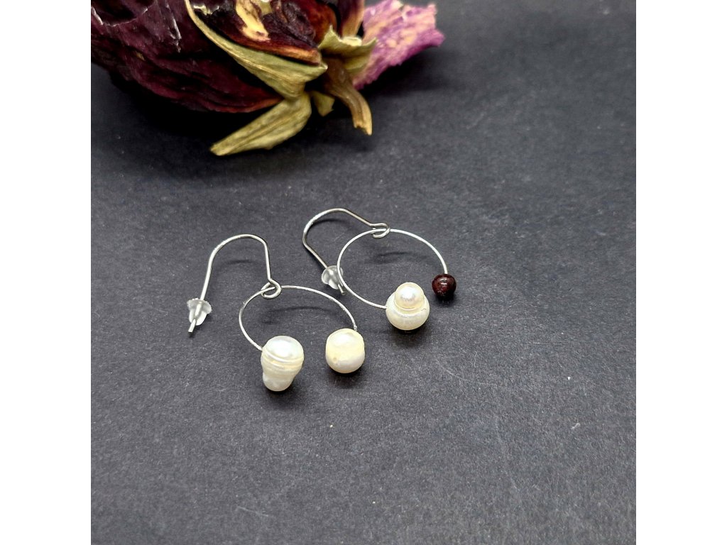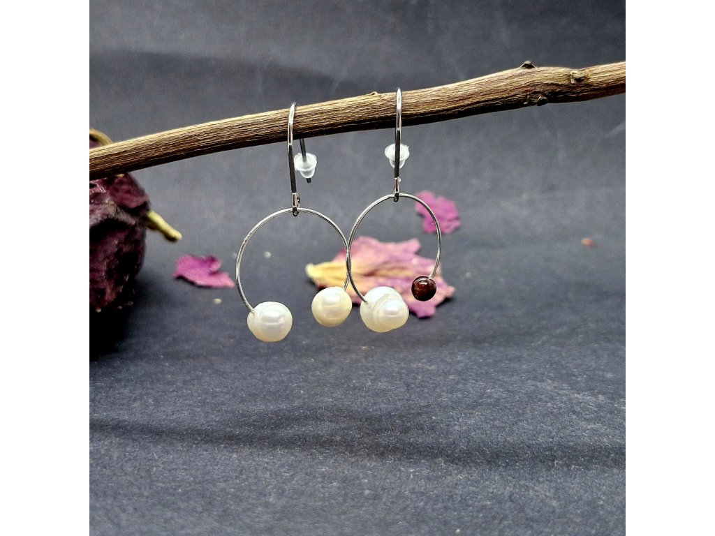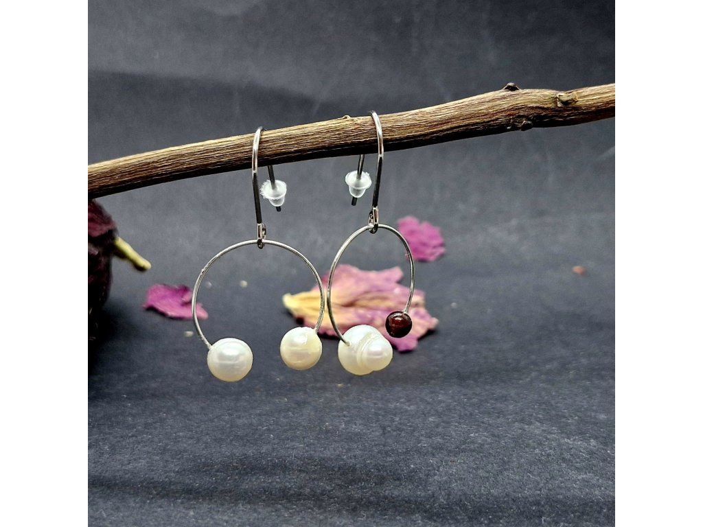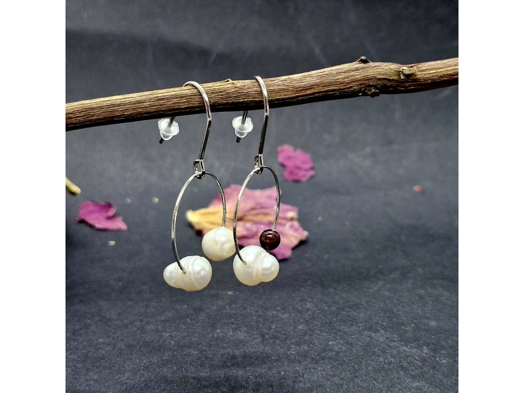Elegantní sladkovodní perly a granát. Náušnice pro všední i sváteční dny. Použili jsme bílé sladkovodní perly, granát a kvalitní chirurgickou ocel.