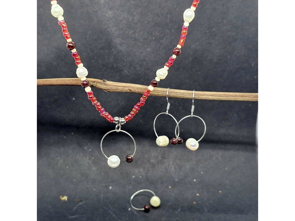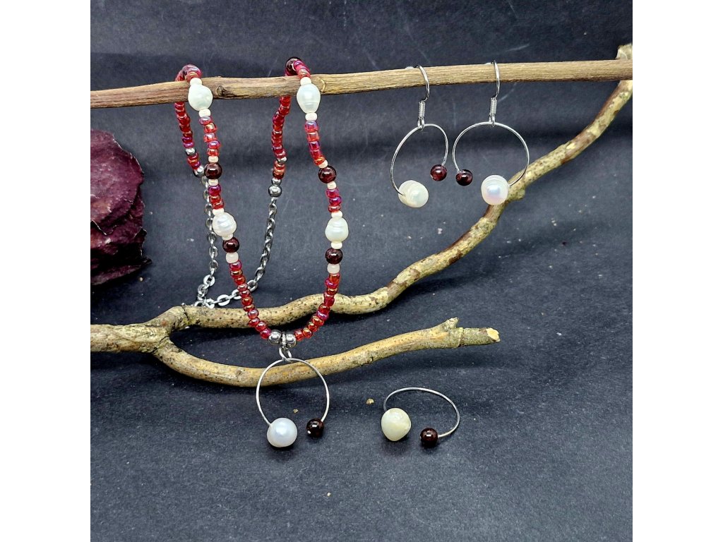 Tato souprava náhrdelníku, náušnic a prstýnku je navržena pro ženy, které milují ucelený styl. Jemnost bílých sladkovodních perel se zde snoubí s energickým nábojem granátu a rokajlu, to vše v pevném objetí nerezové oceli.