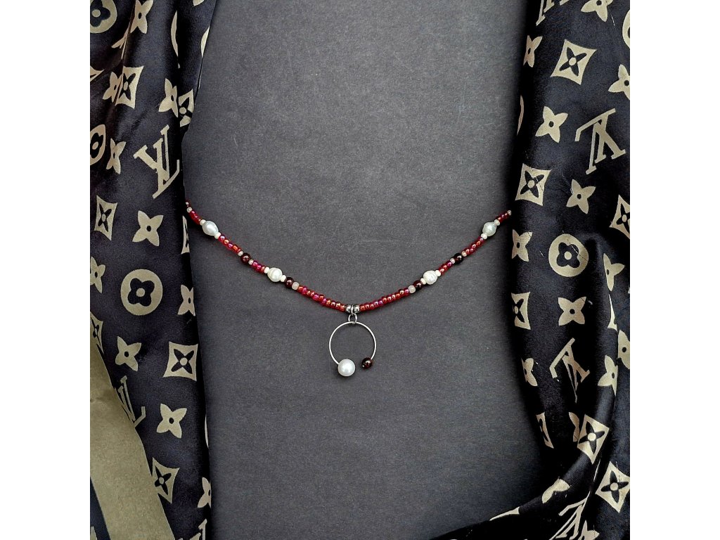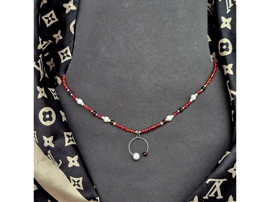 Náhrdelník je z části tvořen řetízkem z nerezové oceli, na kterém je zakomponovaný rokajl, sladkovodní perly a granát. Dominantou je autorský přívěsek.