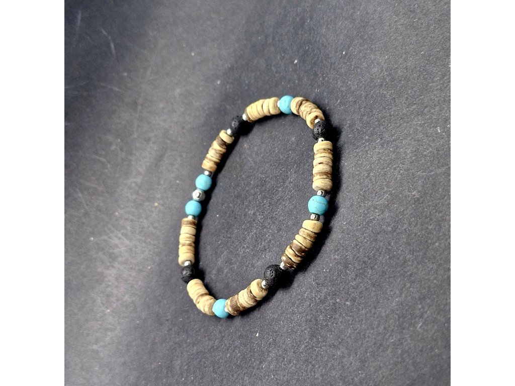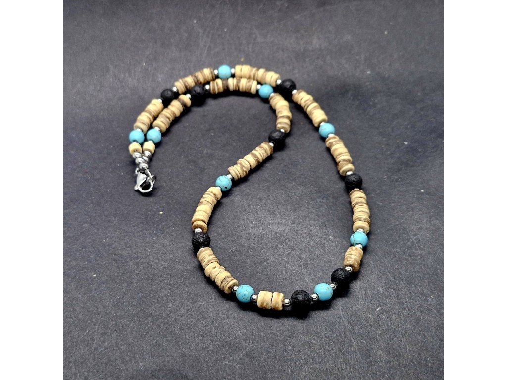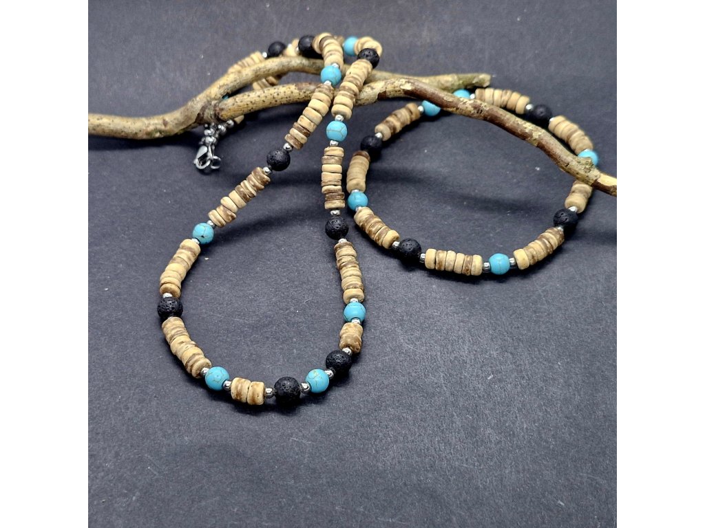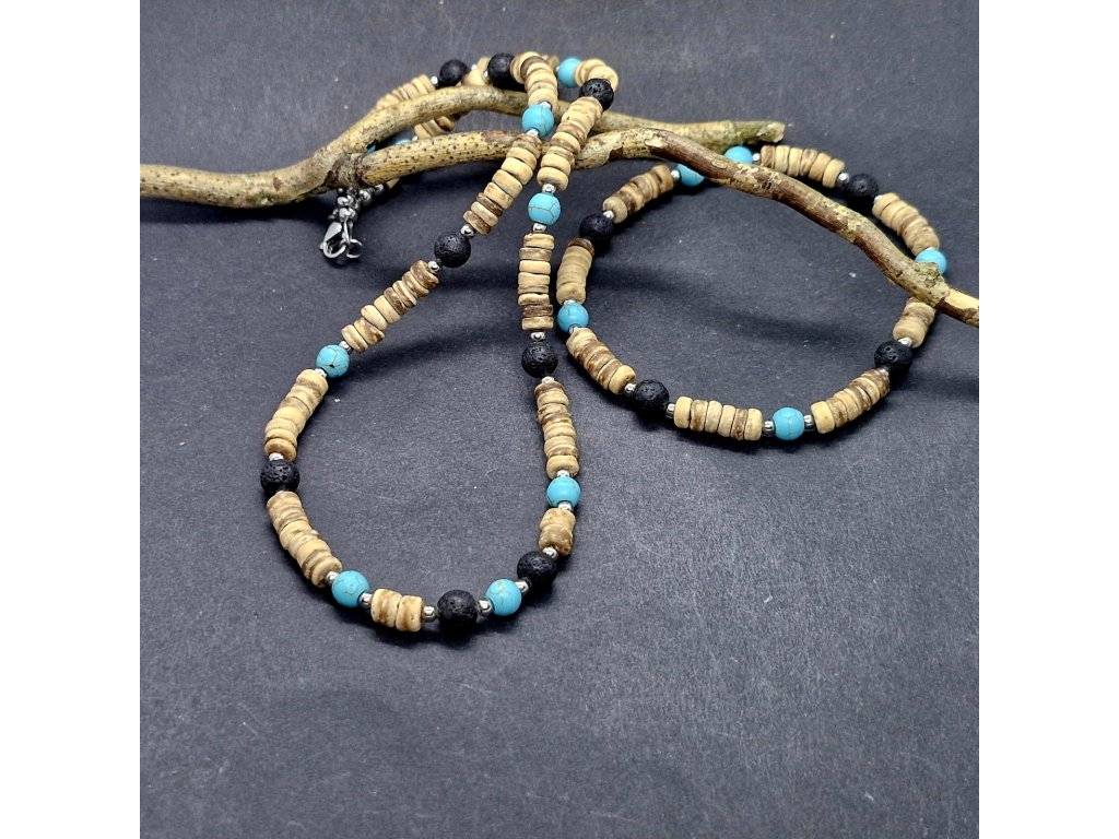 Představujeme soupravu, která mistrovsky balancuje mezi drsnou přírodou a moderním designem. Tento pánský set náhrdelníku a náramku kombinuje matnou černou lávu, osvěžující tyrkenit a hřejivé kokosové dřevo.
