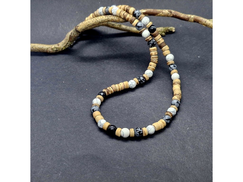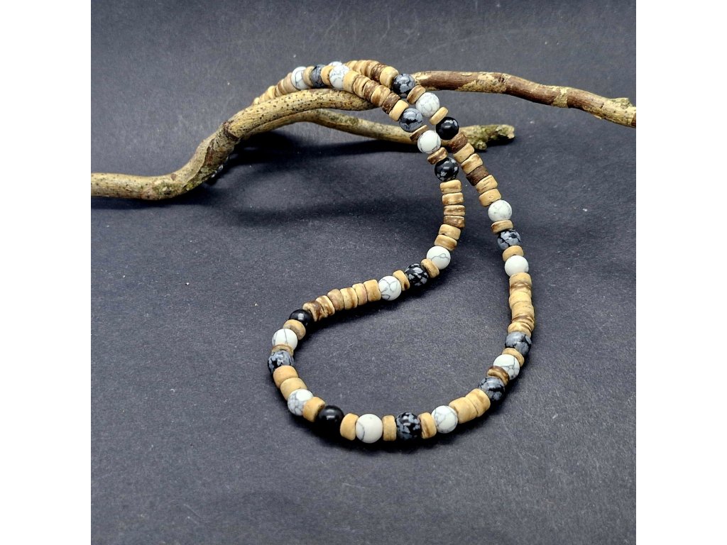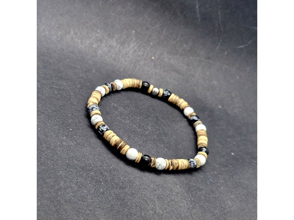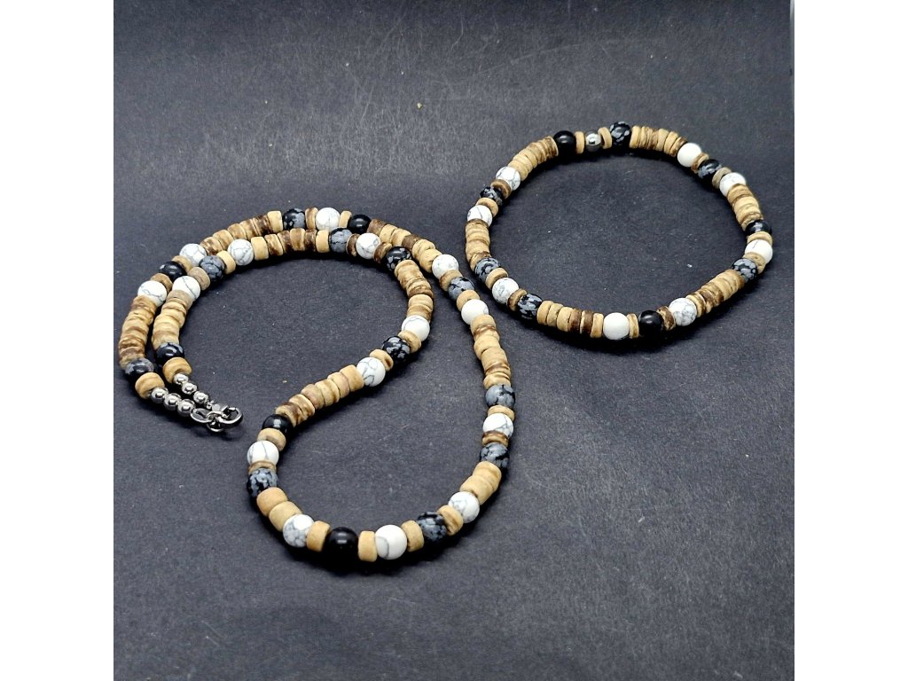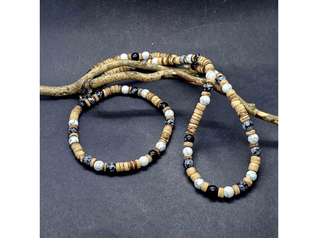 Dominantní černý obsidián (kámen ochrany a síly) se potkává s mramorovaným howlitem, který přináší klid a rozvahu. Vše je propojeno přírodním kokosovým dřevem, které celému setu dodává lehkost a organický charakter. Tato kombinace je symbolem rovnováhy mezi světlem a stínem, mezi akcí a klidem.