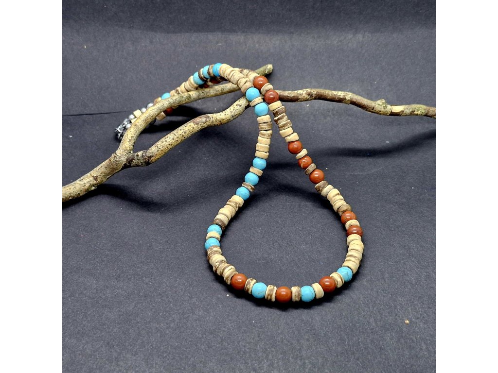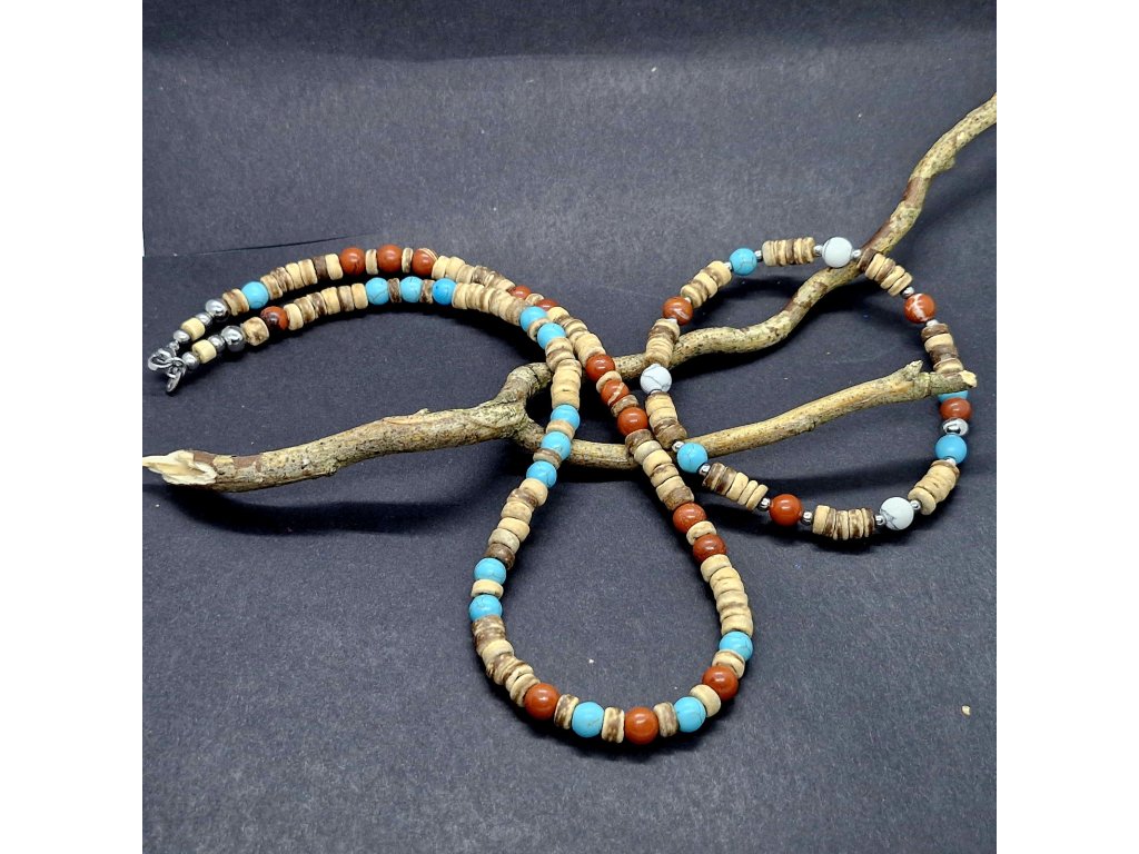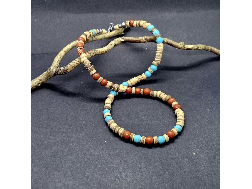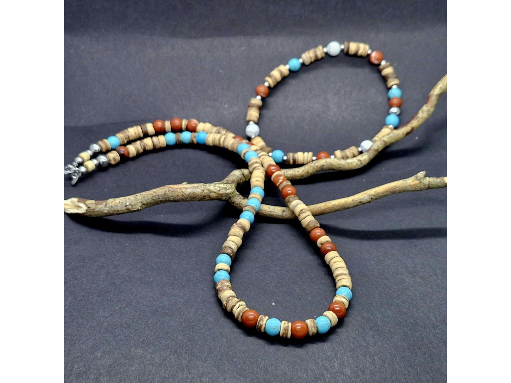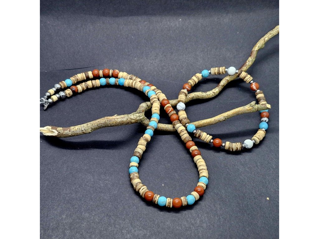 Tato souprava není jen šperk, je to příběh. Spojení exotického kokosového dřeva s drahými kameny vytváří unikátní celek, který dýchá dobrodružstvím. Tyrkenit připomíná barvu oceánu, bílý mramorovaný howlit klid hor a jaspis sílu země. Perfektní společník pro vaše cesty, ať už vedou kamkoliv.