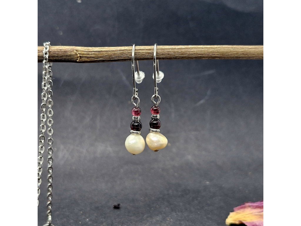 Nepravidelné náušnice z nerezové oceli s granátem a perlami.