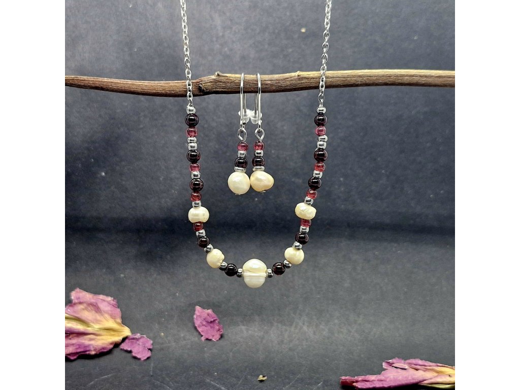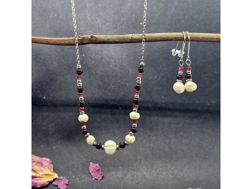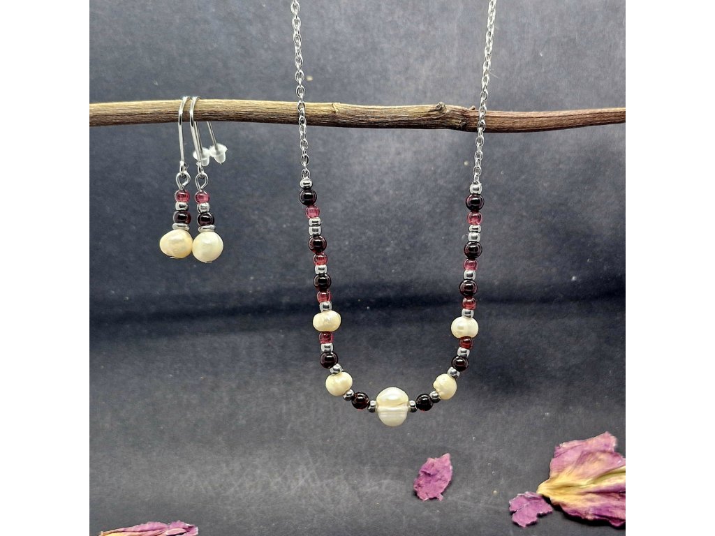 Vášnivá elegance...Náhrdelník a náušnice z nerezové oceli s granátem a perlami.