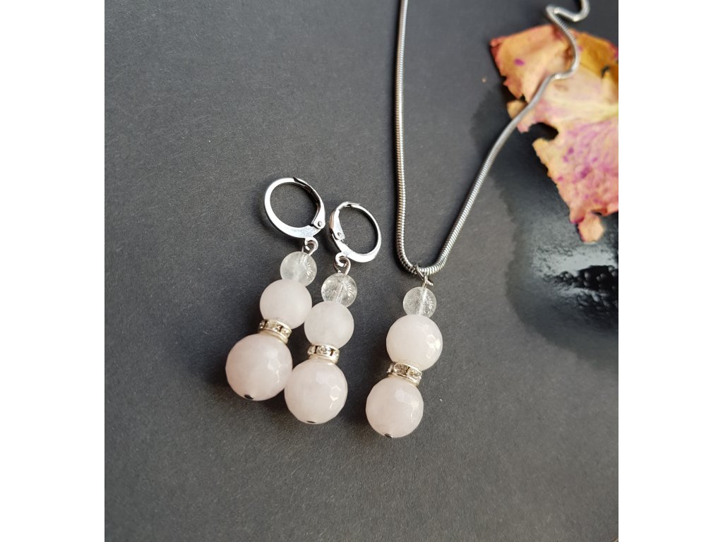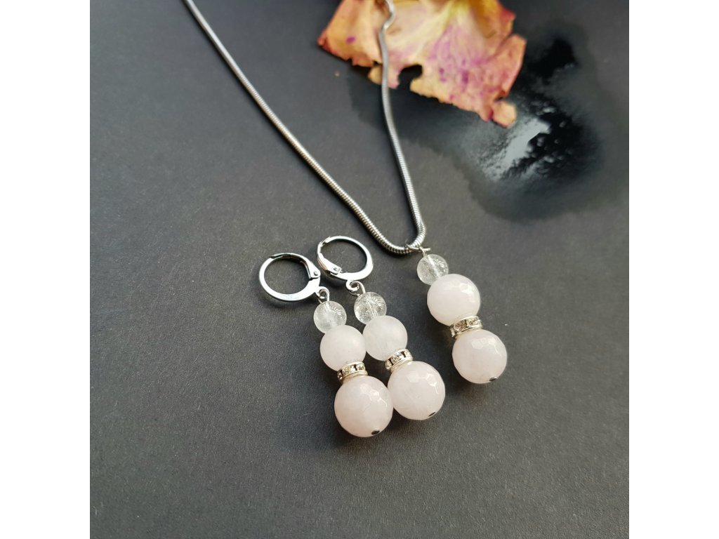 Rozměry: Náhrdelník - 43,5 cm. Přívěsek 3 cm. Náušnice - Celková délka včetně mechanického zapínání 4 cm. Průměr růženínu 10 a 8 mm. Křišťál 6 mm.