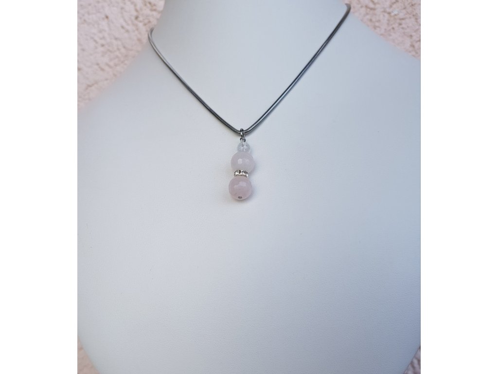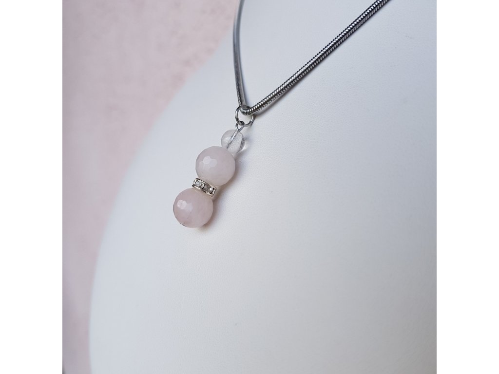Náhrdelník je vyroben z hadího řetízku, na kterém je zavěšen originální přívěsek z růženínu, křišťálu a rondelek s kamínky.
