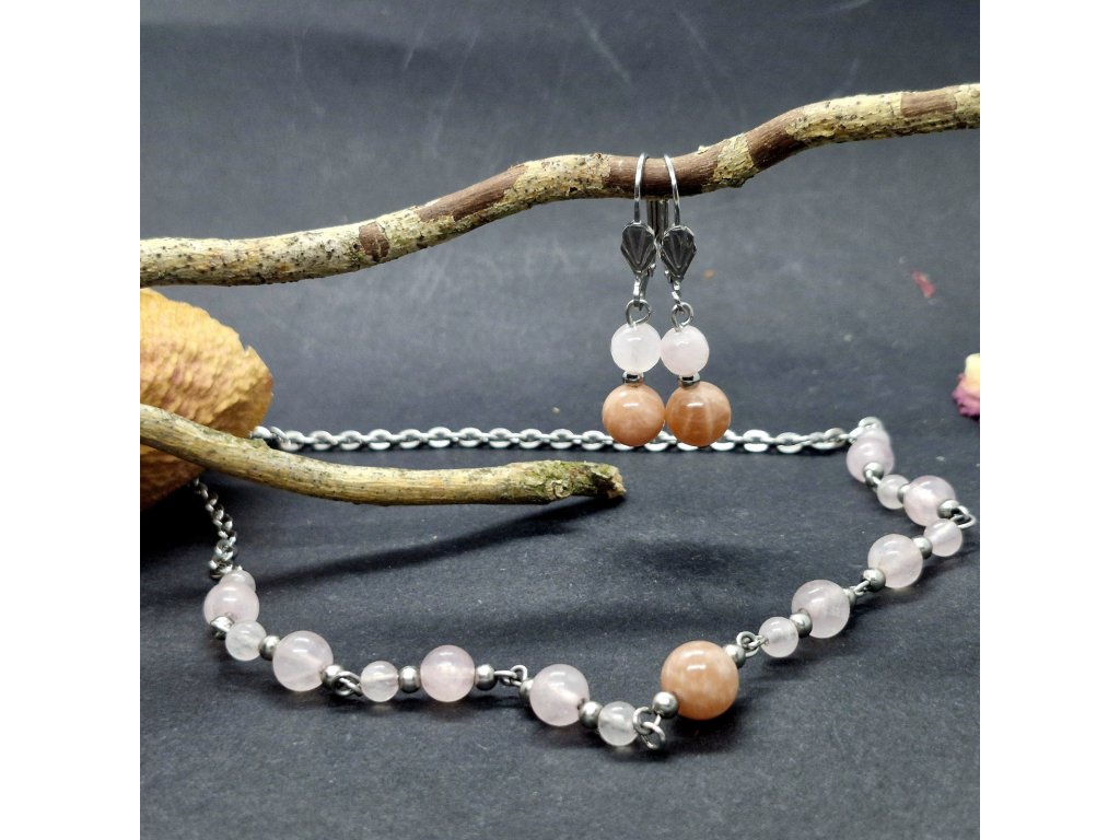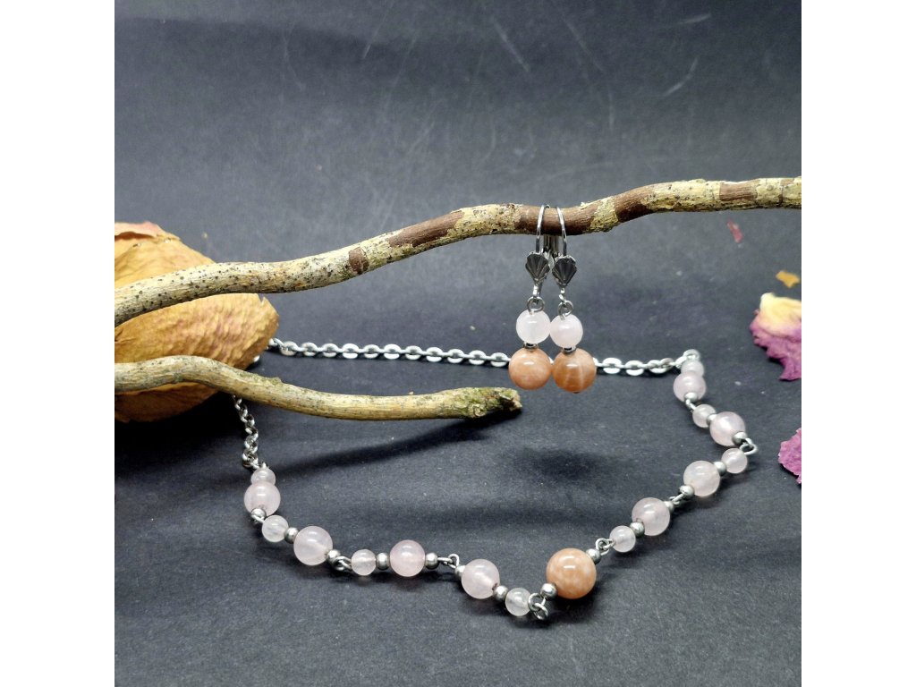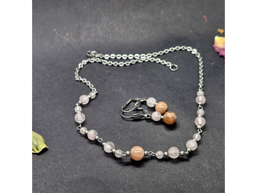 Představujeme Vám jemnou soupravu náhrdelníku a náušnic pro každou příležitost. Použili jsme minerály růženínu a achátu, které jsou pečlivě naketlované na řetízku z kvalitní nerezové oceli, která nemění barvu ani tvar a je vhodná i pro alergiky.