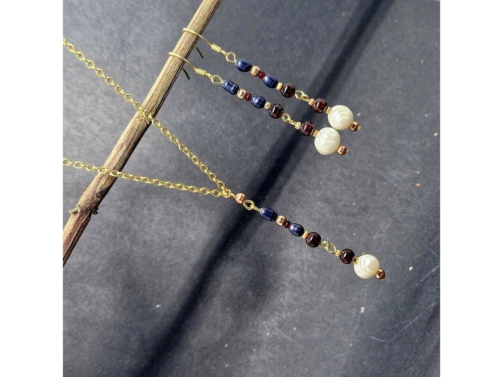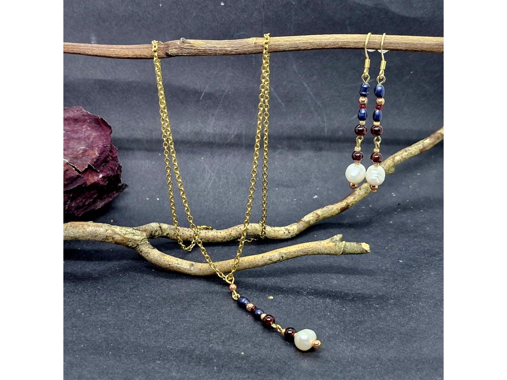 Máme pro vás něco speciálního...Soupravu náhrdelníku a náušnic, ve které se snoubí klasická krása perel s temperamentem granátu a září zlata. Tato sada není jen o kráse, je o pocitu výjimečnosti.