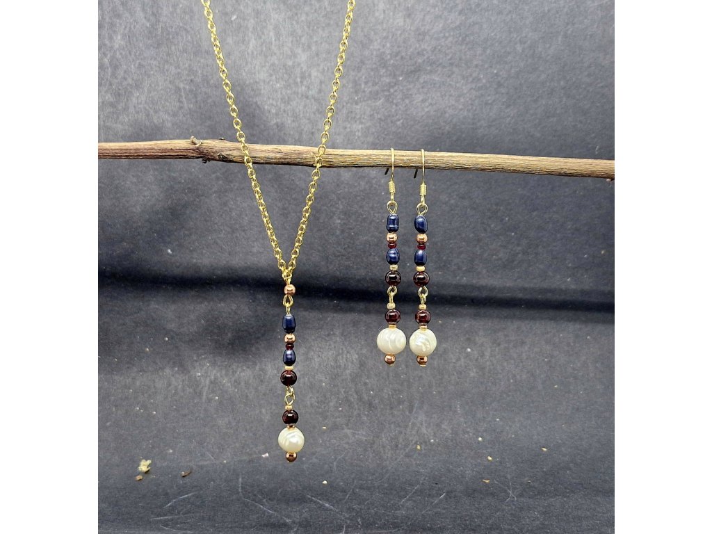 Rozměry: Délka řetízku 46 cm. Délka přívěsku 5 cm. Náušnice - délka včetně hráčku 6 cm. Modré perly cca 5 mm. Bílé perly cca 7 mm. Granát 4 mm. Rokajl cca 2 mm.