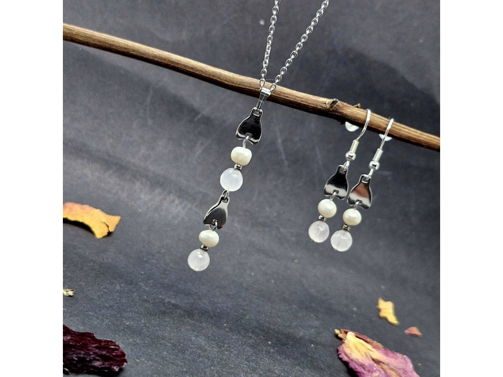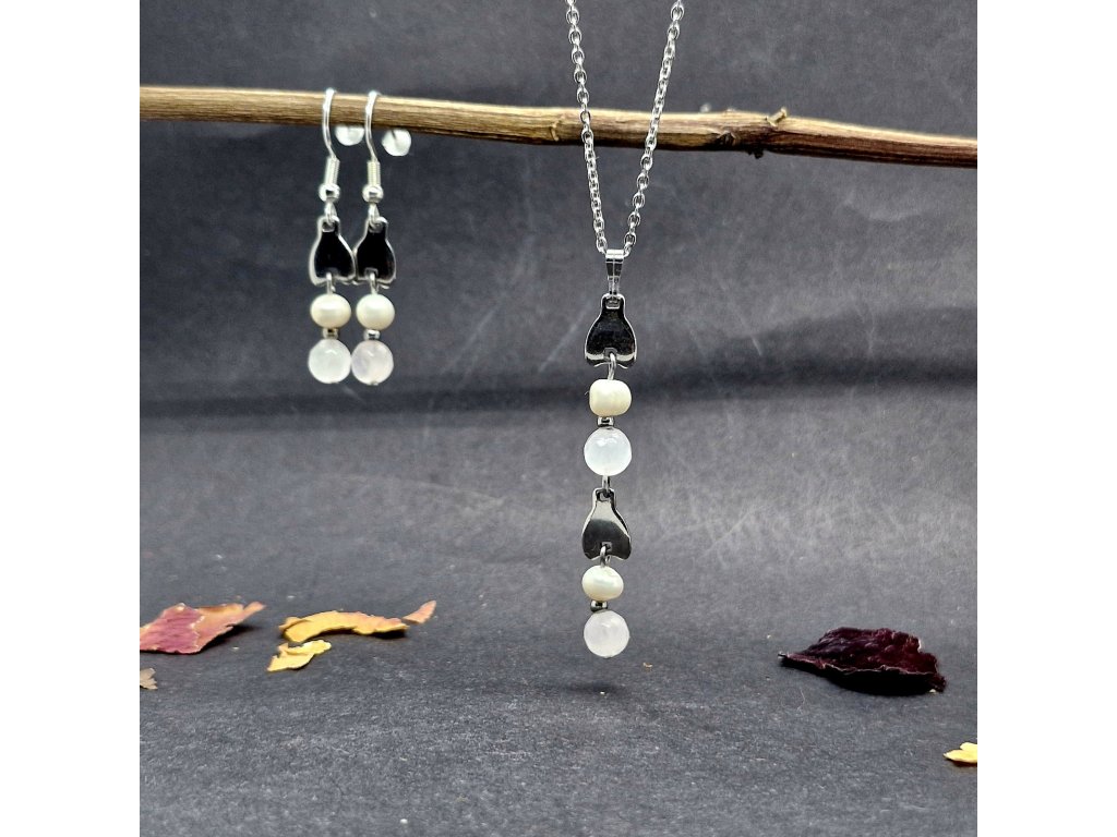Autorský přívěsek je tvořen z nerezové oceli, růženínu a sladkovodních perel. Zavěšen na jemném řetízku z kvalitní nerezové oceli.