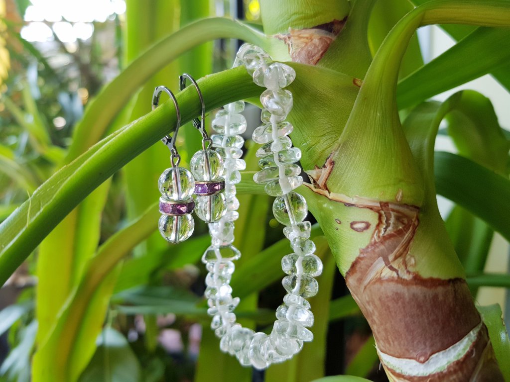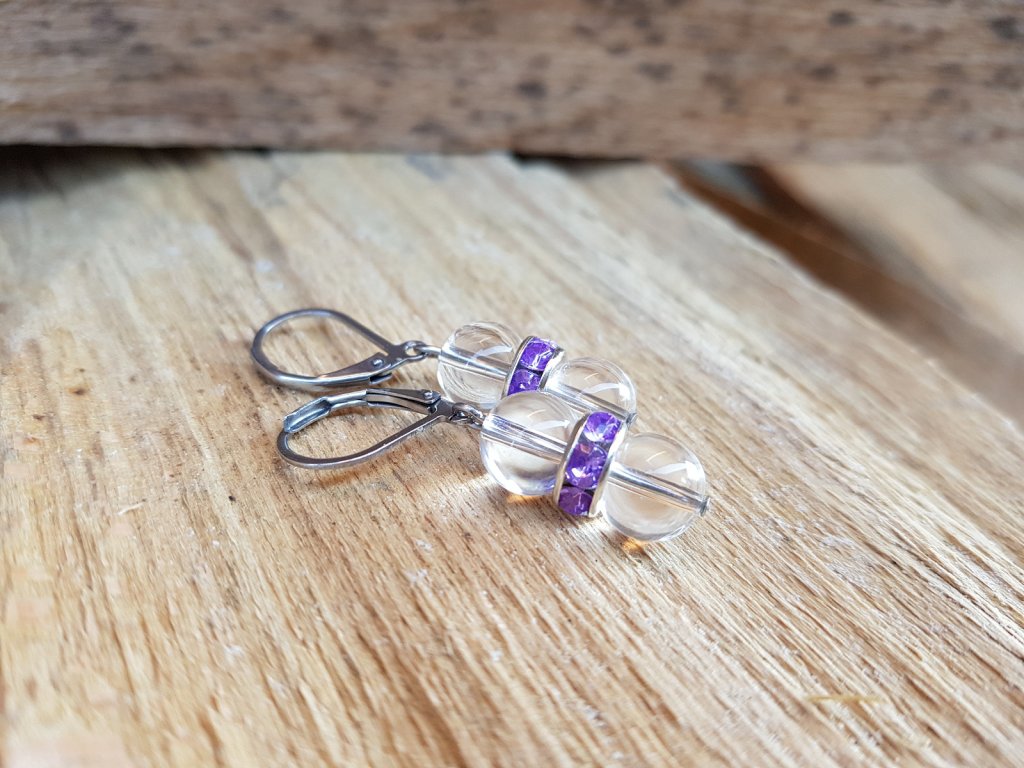 Jako kapky rosy po ránu... Souprava náramku a náušnic. Náušnice jsou z chirurgické oceli, křišťálu o průměru 8 mm a rondelek s třpytivými kamínky šeříkové barvy. Na náramek jsme použili zlomky křišťálu a křišťálovou kuličku 8 mm.