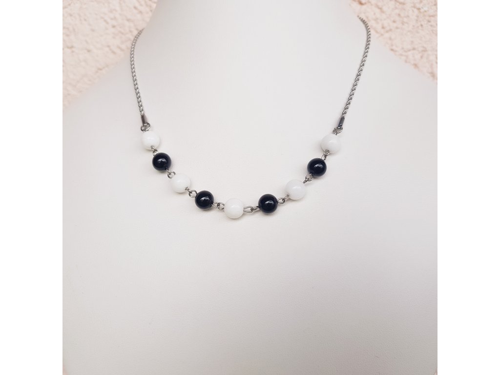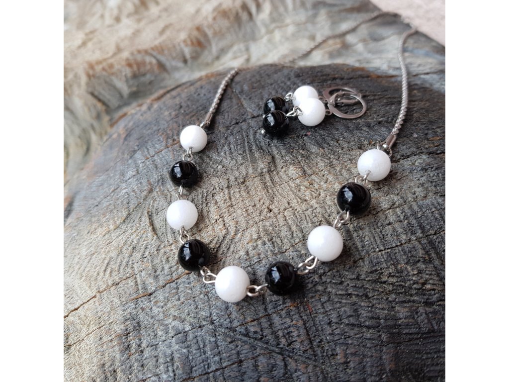 Náhrdelník jsme vytvořili z ozdobného řetízku z kvalitní nerezové oceli, na kterém jsou ručně naketlované kuličky přírodního onyxu a malajského nefritu.