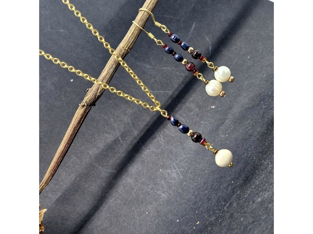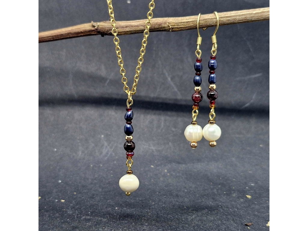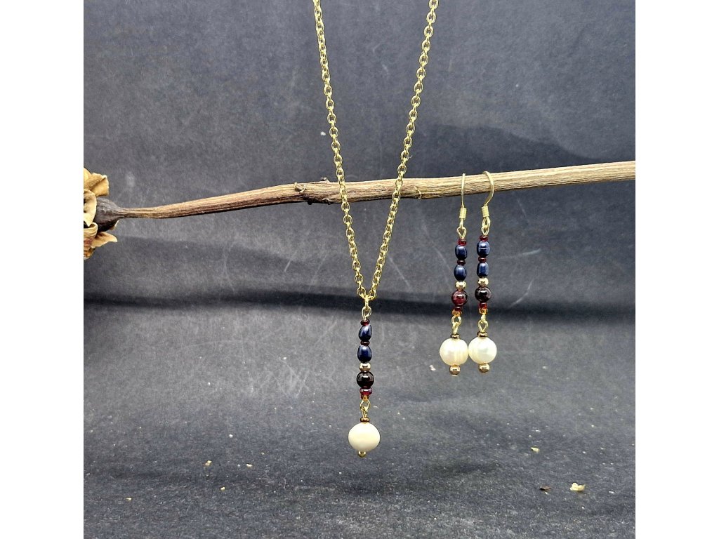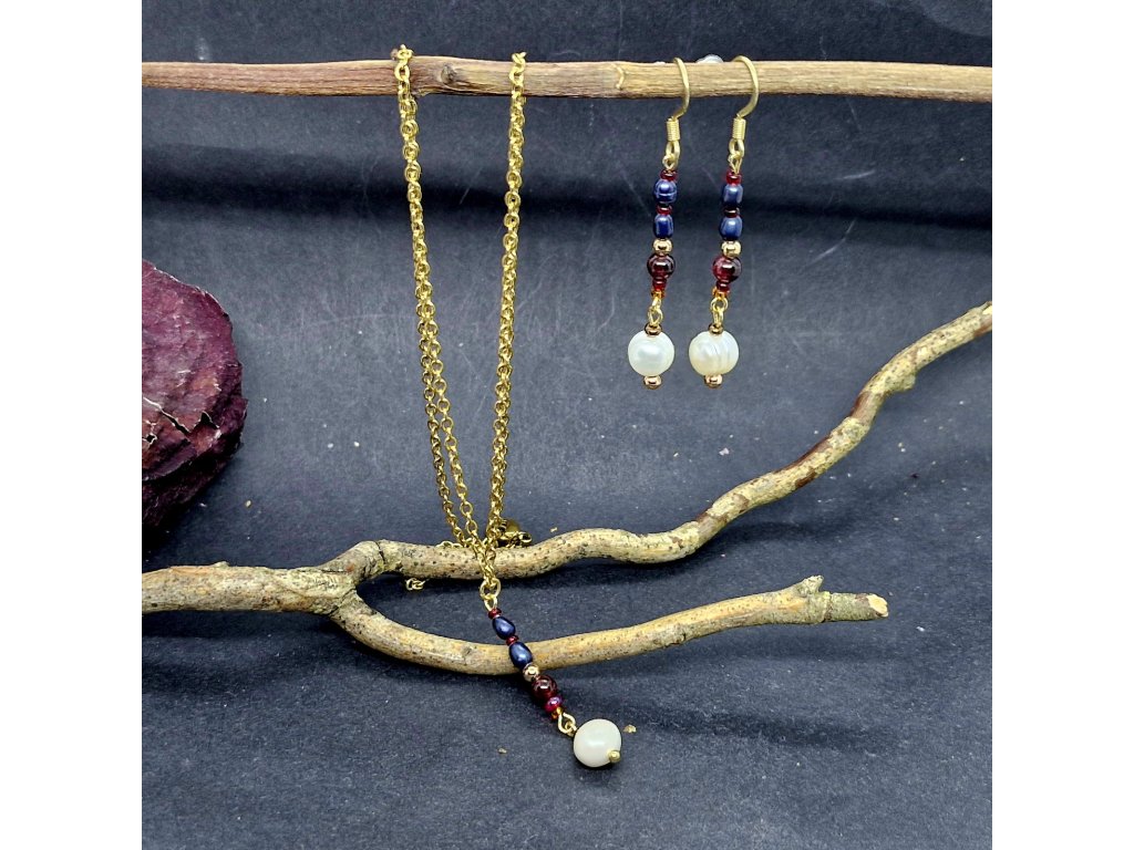 Zlatý dotek elegance...Souprava s perlami a granátem v pozlacené oceli.