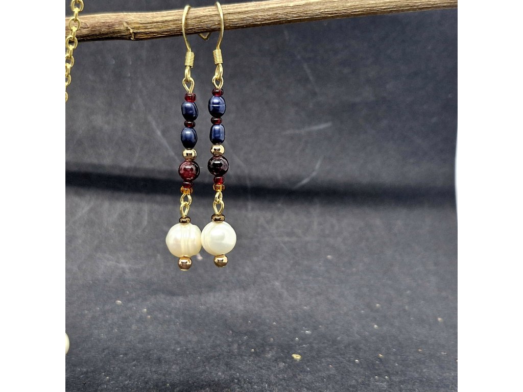 Rozměry: Délka náhrdelníku 46 cm. Délka přívěsku cca 4 cm. Délka náušnic včetně háčku 5 cm. Modré perly cca 5 mm. Granát 4 mm. Bílé perly cca 7 mm. Rokajl cca 2 mm.