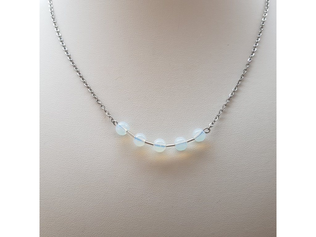 Souprava náhrdelníku a náušnic. Tvořena je z nerezové oceli se zakomponovanými kuličkami opalitu a rokajlovými tyčinkami vlastní výroby se stříbrným průtahem.