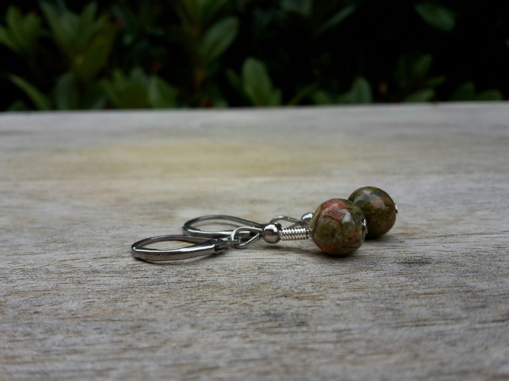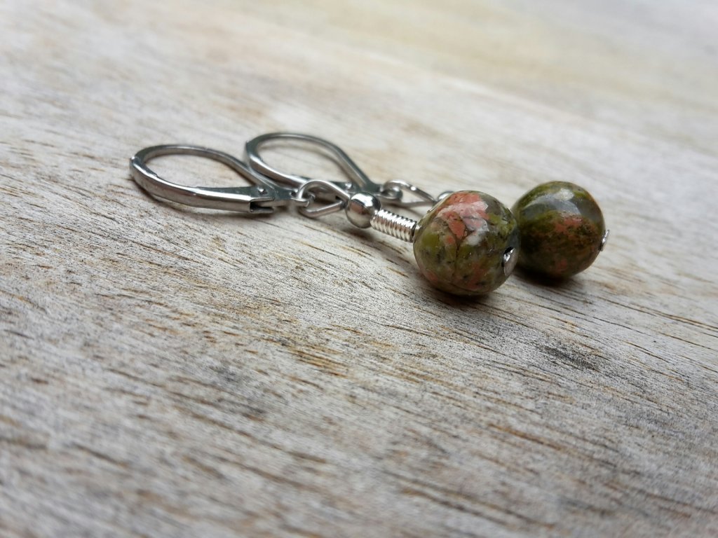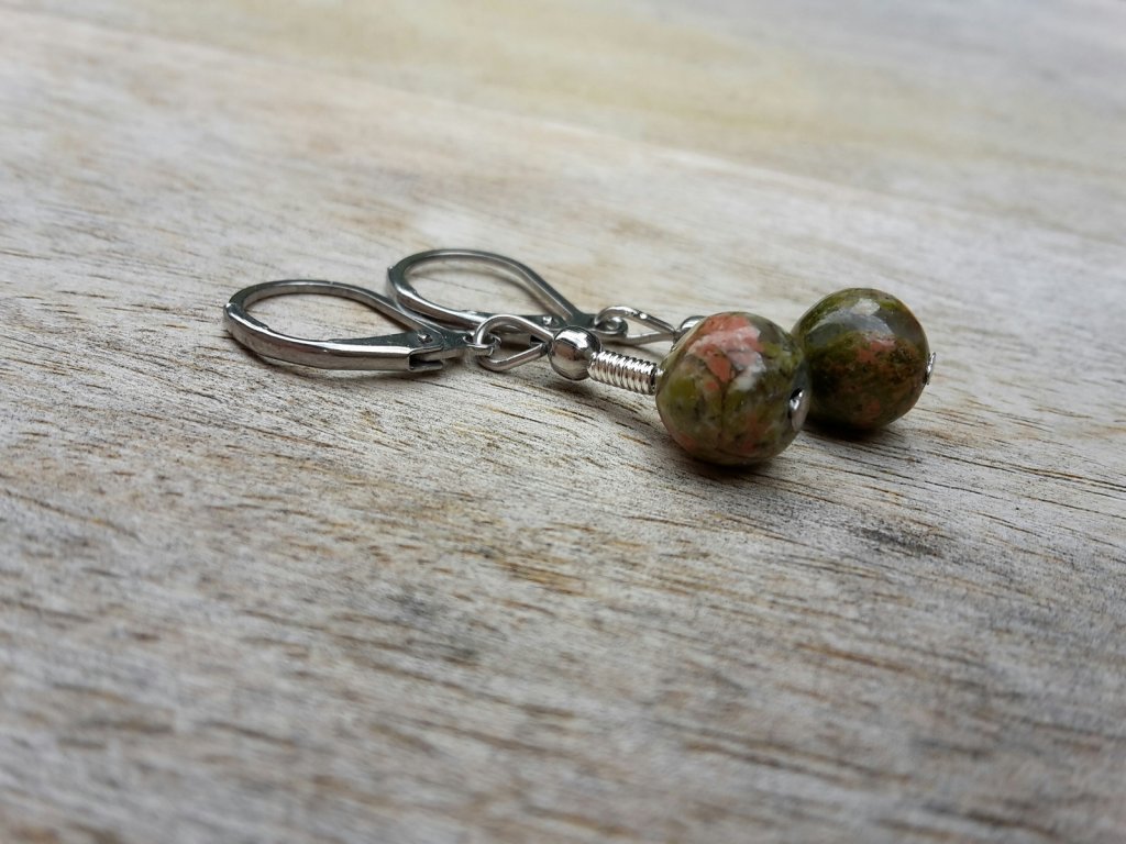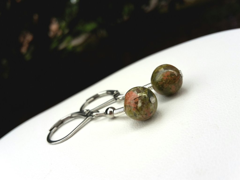 Jednoduché a přitom elegantní náušničky jsou z chirurgické oceli s přívěskem unakitu o průměru 8 mm, Ag spirálky a kuličky z chirurgické oceli. Unakit je kamenem vizí a věštění, uvádí do rovnováhy city s duchovnem, uzemňuje, vhodný k meditacím, ukazuje, kdy je třeba udělat kompromis, objasňuje příčiny zablokování, umožňuje „znovuzrození“, pomáhá při léčení minulých životů tím, že se vydá ke zdroji problému, vyplaví ho na povrch a napraví jej, odstraňuje překážky bránící duchovnímu růstu. Rozměry: celková délka 3,5 cm.