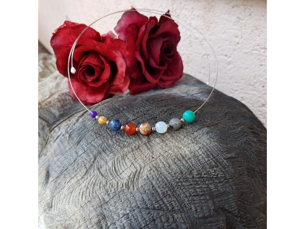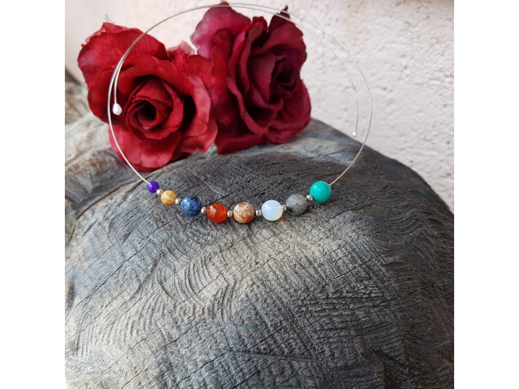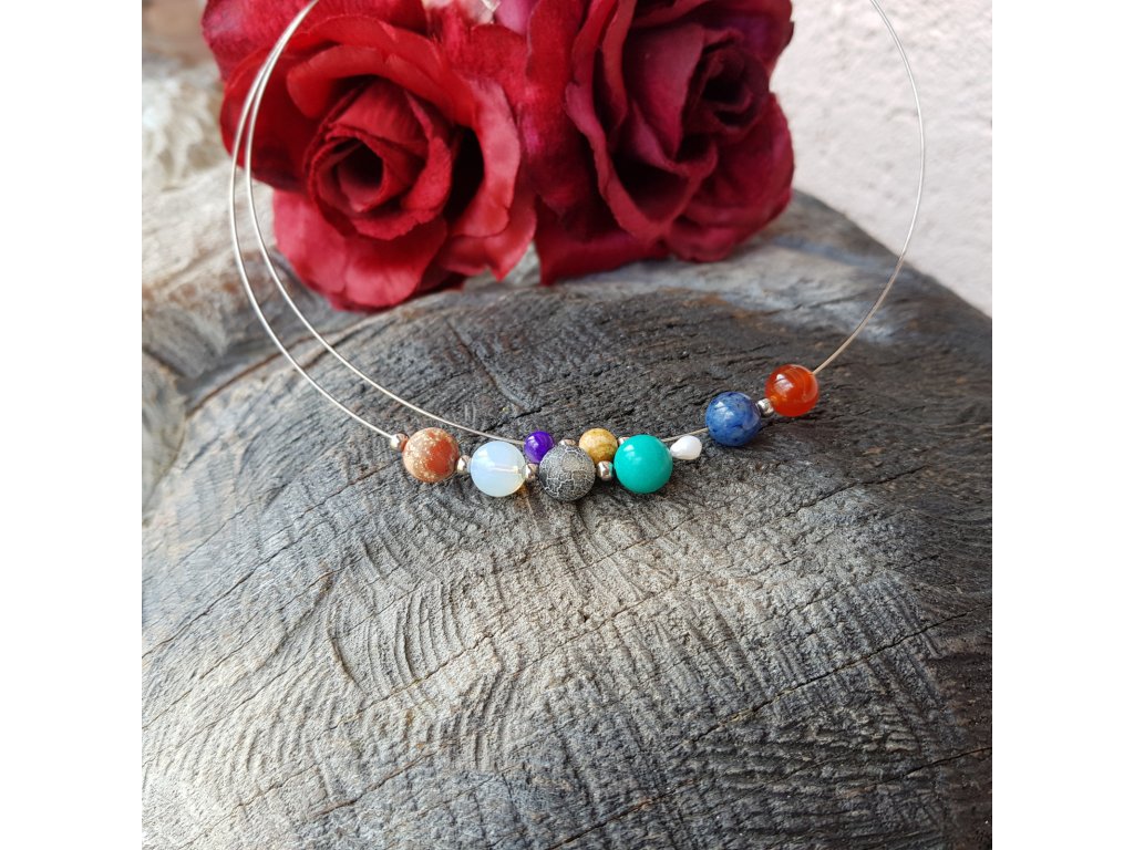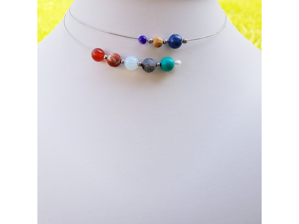 Náhrdelník je z pružného ocelového lanka, na němž jsou volně zakomponované kuličky tyrkysu, achátu, jaspisu, karneolu, sodalitu, měsíčního kamene, obsidiánu a korálky z nerezové oceli. Po stranách jsou napevno zakomponované říční perličky. Díky slabé oceli krásně vyniknou minerály, které jakoby levitují. Lze je libovolně posouvat a nosit na různé způsoby.