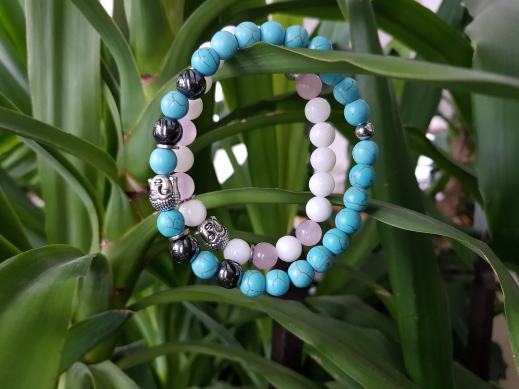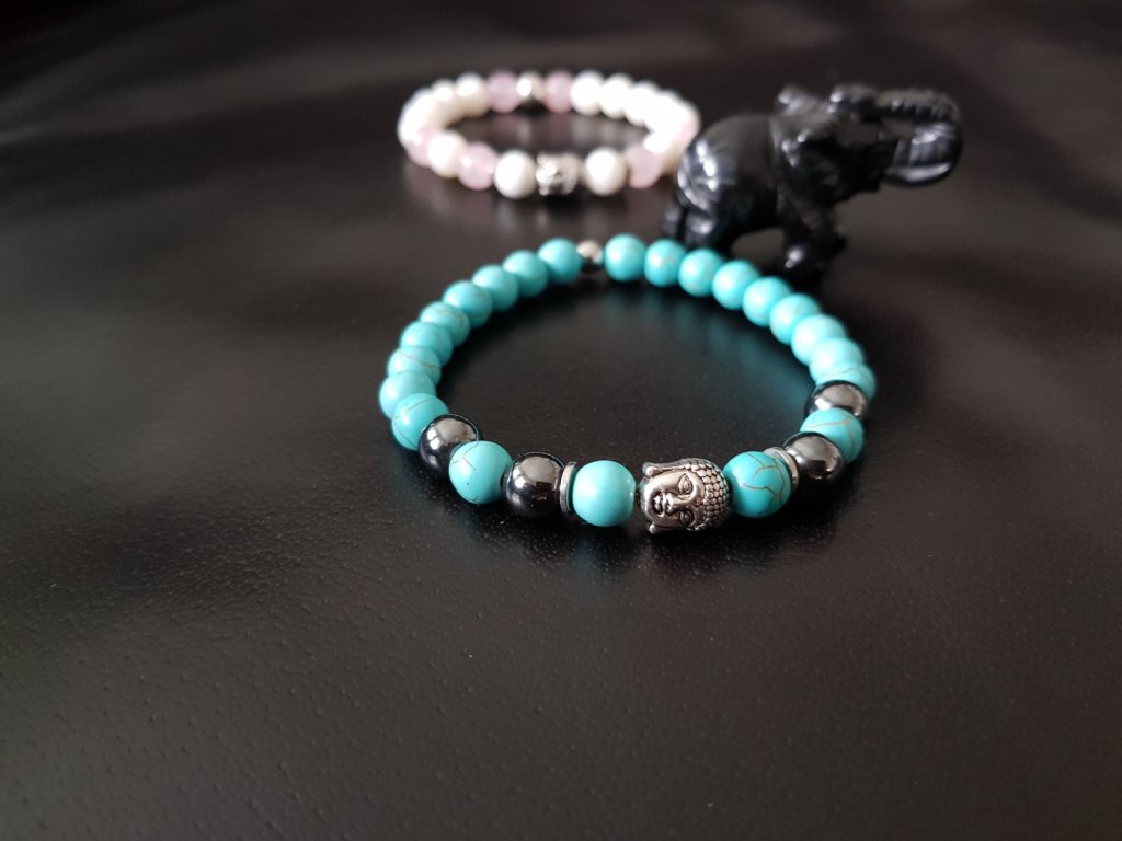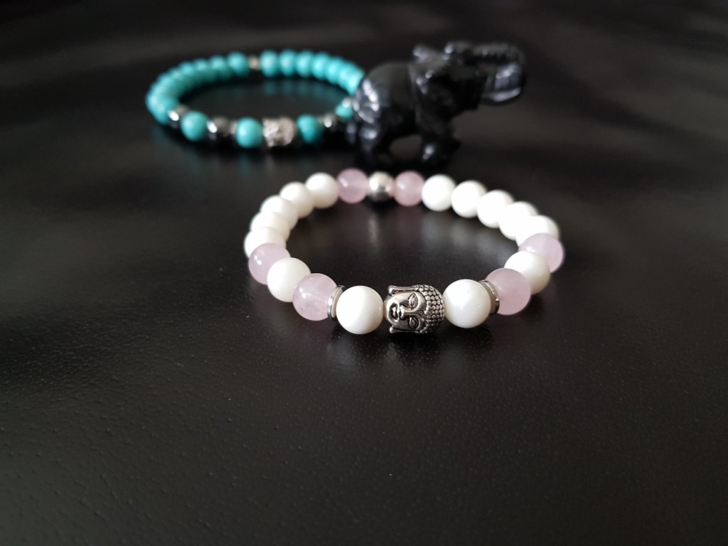 Pro lásku, přátelství, harmonii... Náramky pro zamilované. Pánský je tvořen z tyrkysu a hematitu o průměru 8 mm. Dámský je z kuliček perleťě a růženínu 8 mm. Dominantou jsou kovové hlavičky budhy.